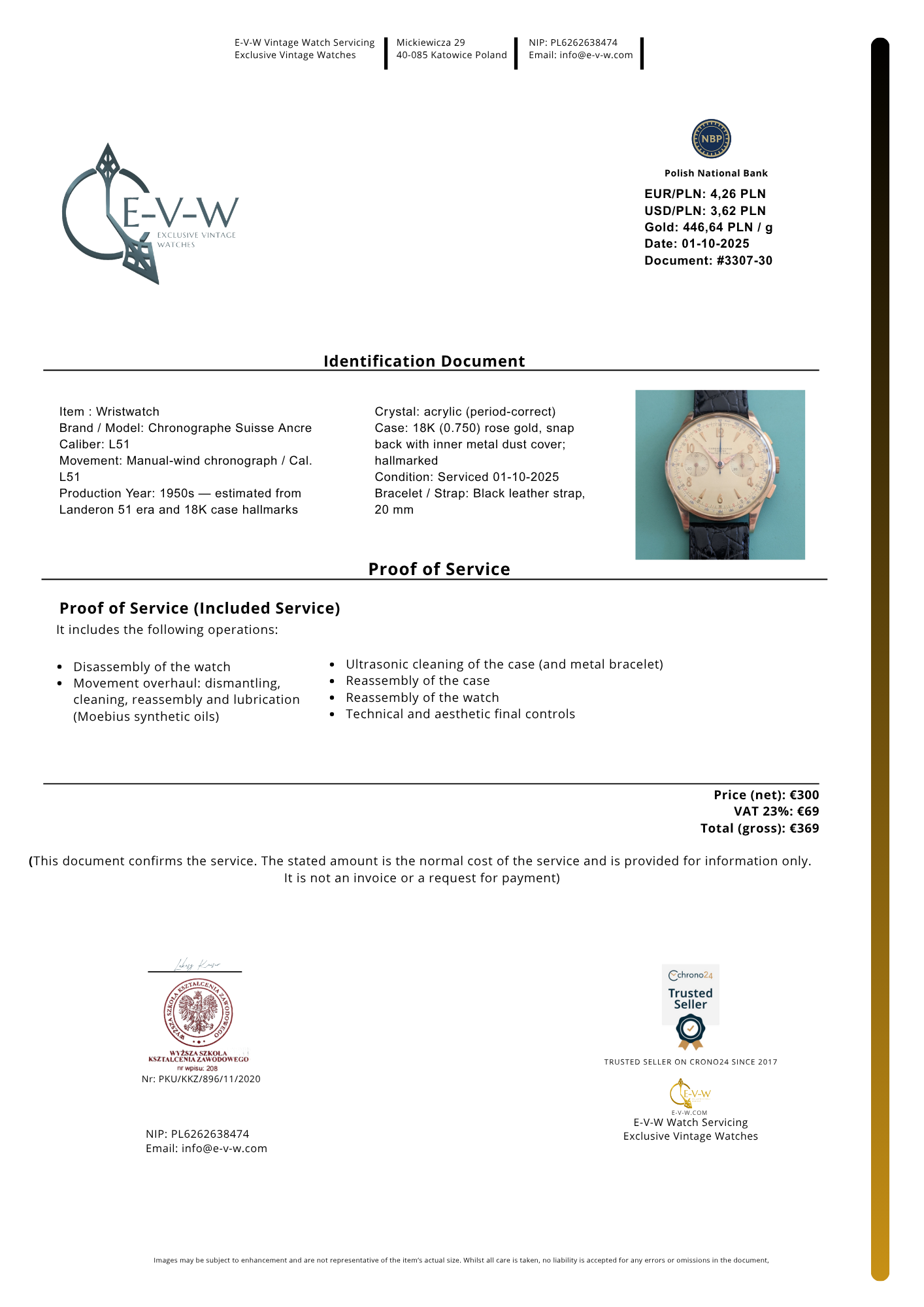 Mouvement : Remontage manuel, Cal. Landeron 51, 17 rubis , ~18 000 alt/h ; révisé en octobre 2025 ( certificat ).