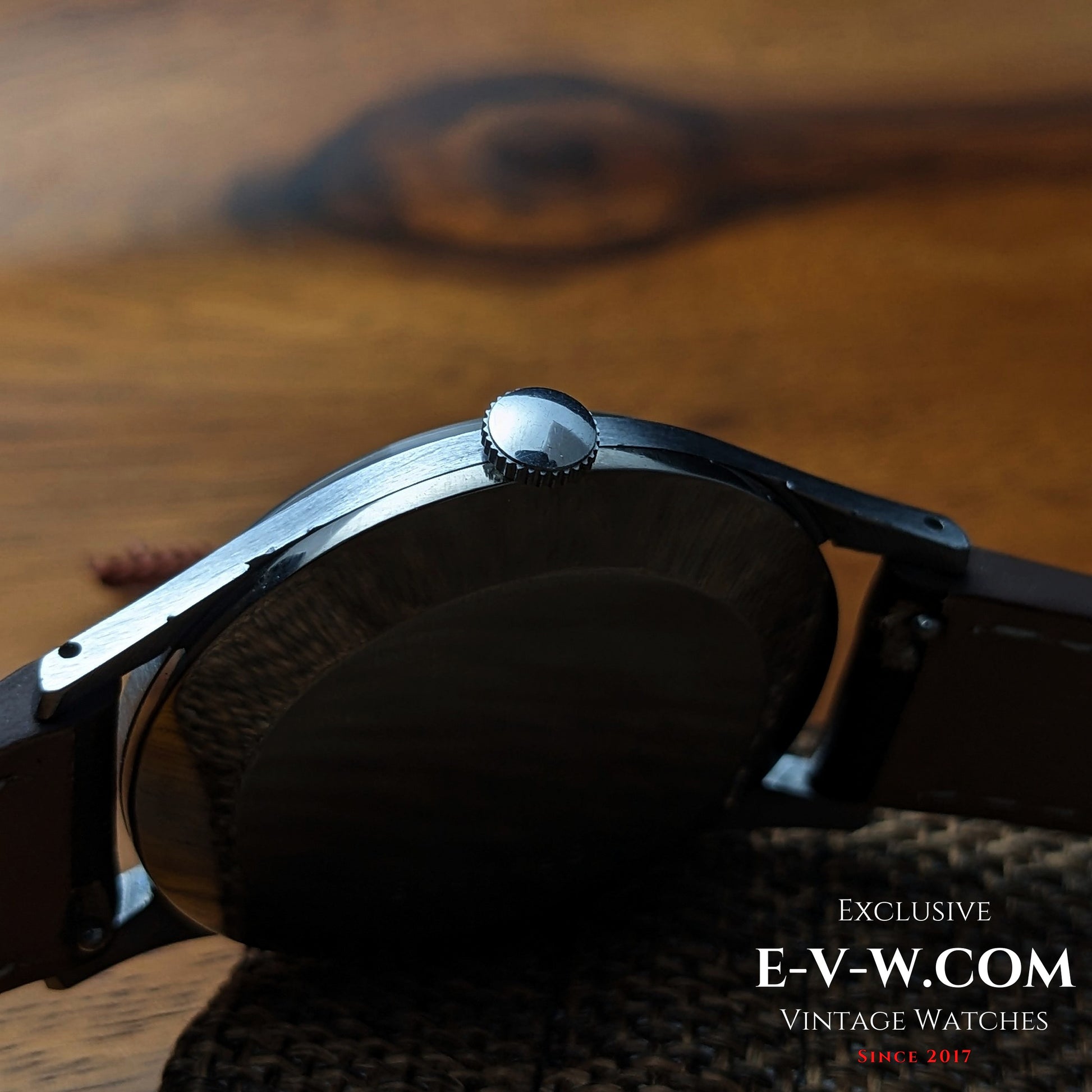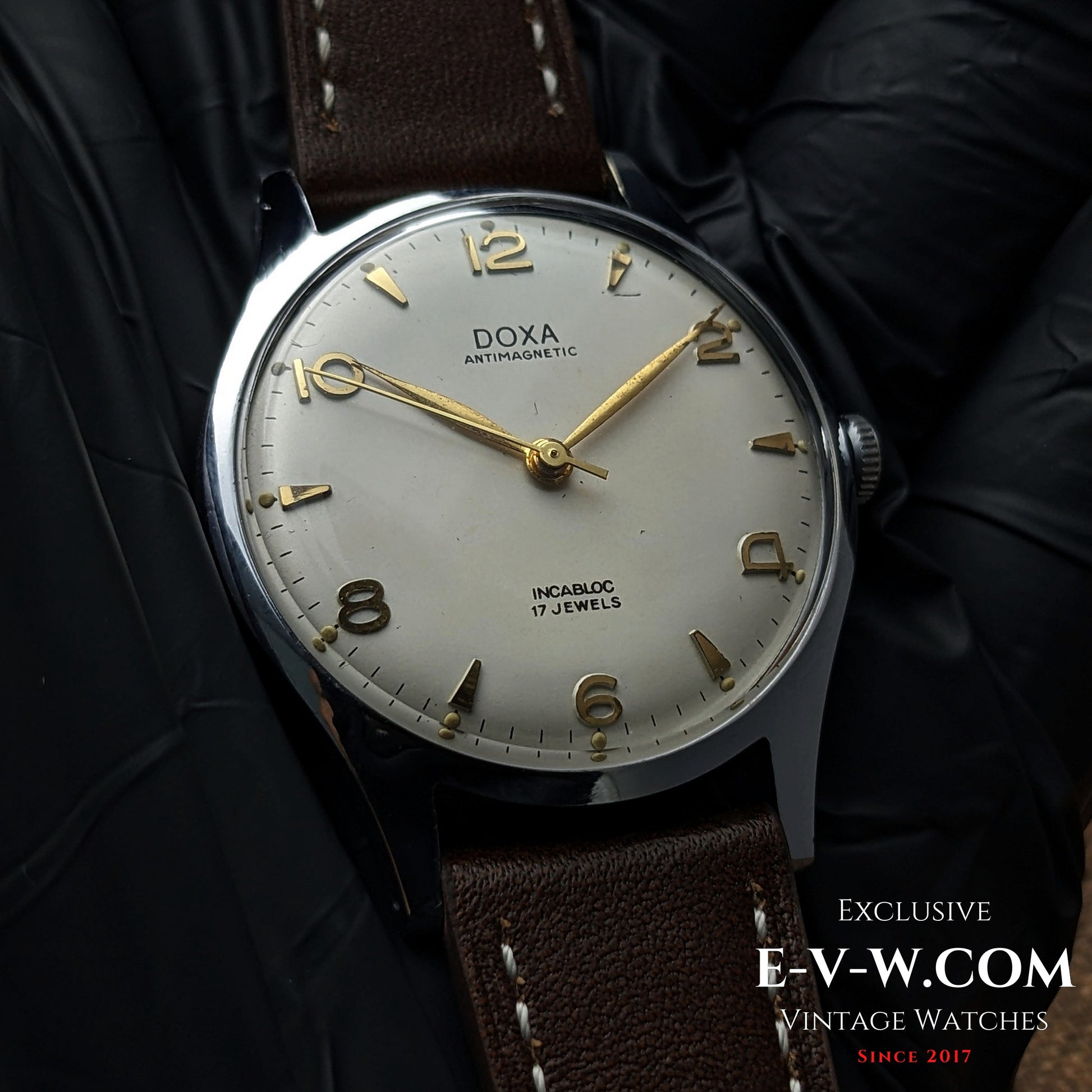 Une DOXA « Antimagnetic » épurée, typique du milieu du XXe siècle, avec ses chiffres 12-3-6-9 appliqués et ses index bâtons, animée par le calibre 380 FFR à remontage manuel (17 rubis, Incabloc). Le cadran ivoire argenté présente une belle harmonie avec ses aiguilles dorées et sa trotteuse centrale : un charme d’époque sans prétention.