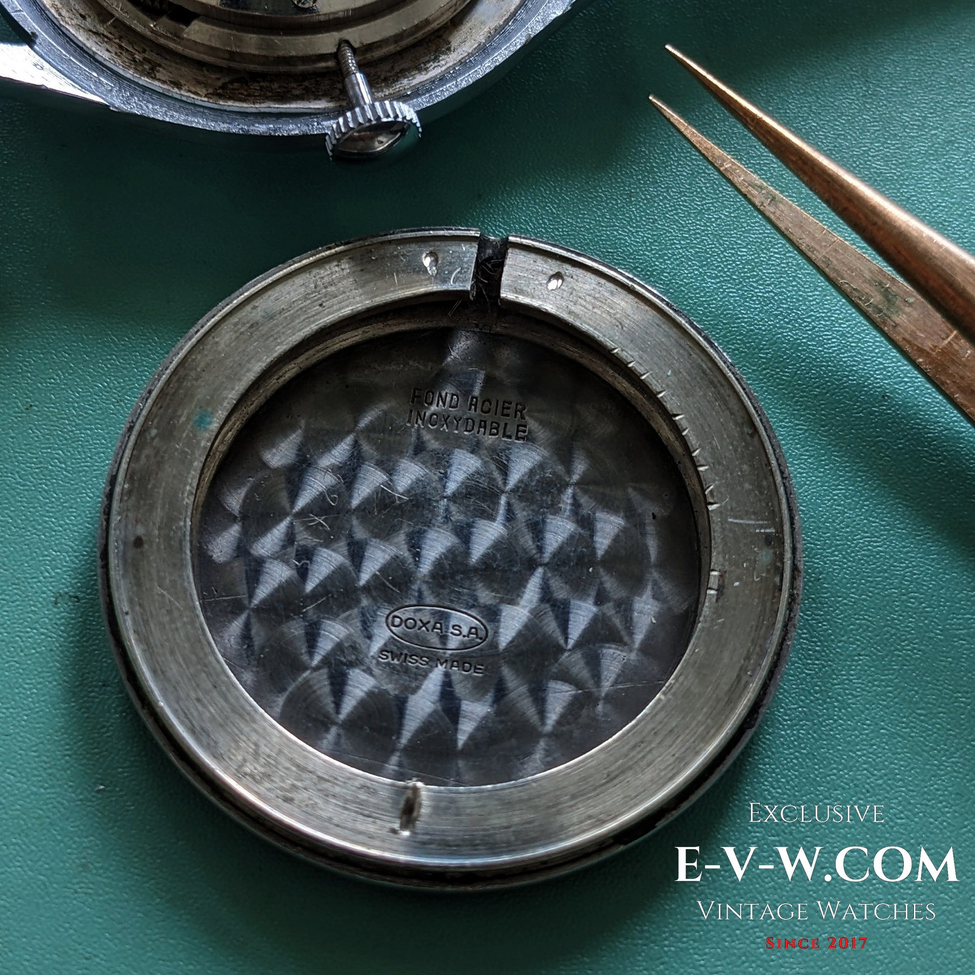 Boîtier : fond rond à bouton-pression ; intérieur « FOND ACIER INOXYDABLE » DOXA SA
