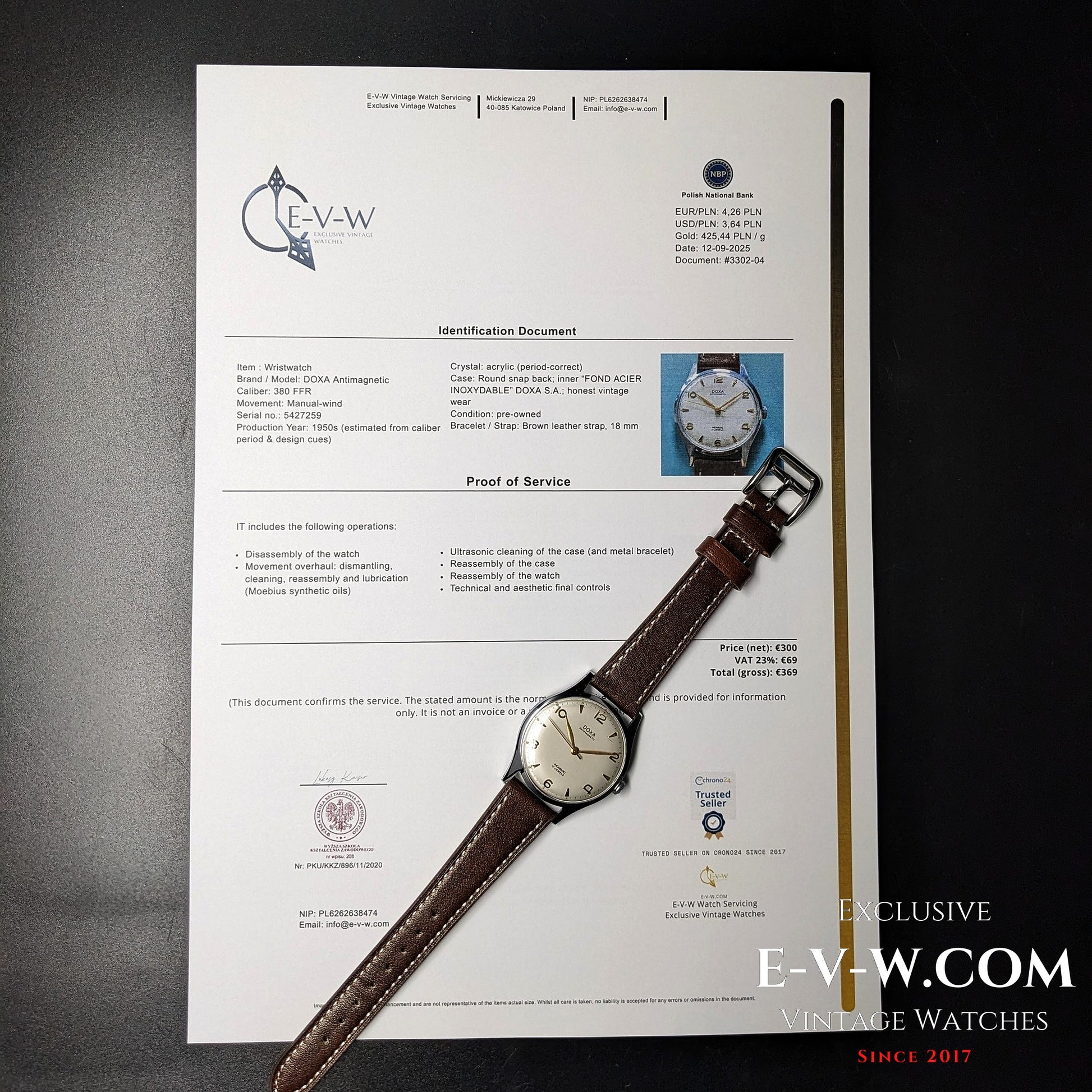 Mouvement : Calibre 380 FFR à remontage manuel signé DOXA, 17 rubis, ~18 000 A/h, Incabloc ; révisé en septembre 2025