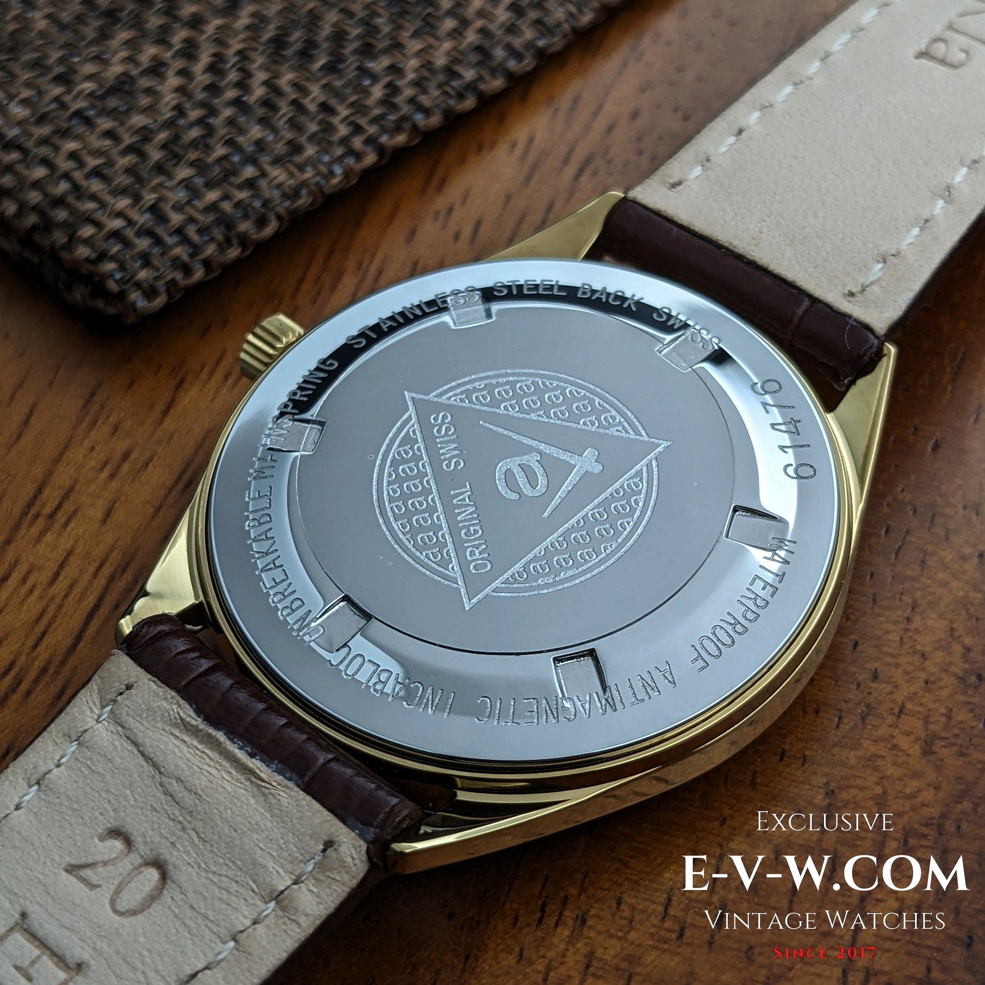Cet exemplaire possède un cadran champagne remis à neuf par un professionnel et un boîtier replaqué, offrant un aspect net et lumineux tout en préservant les index, les aiguilles et le caractère général du milieu du siècle d'origine.