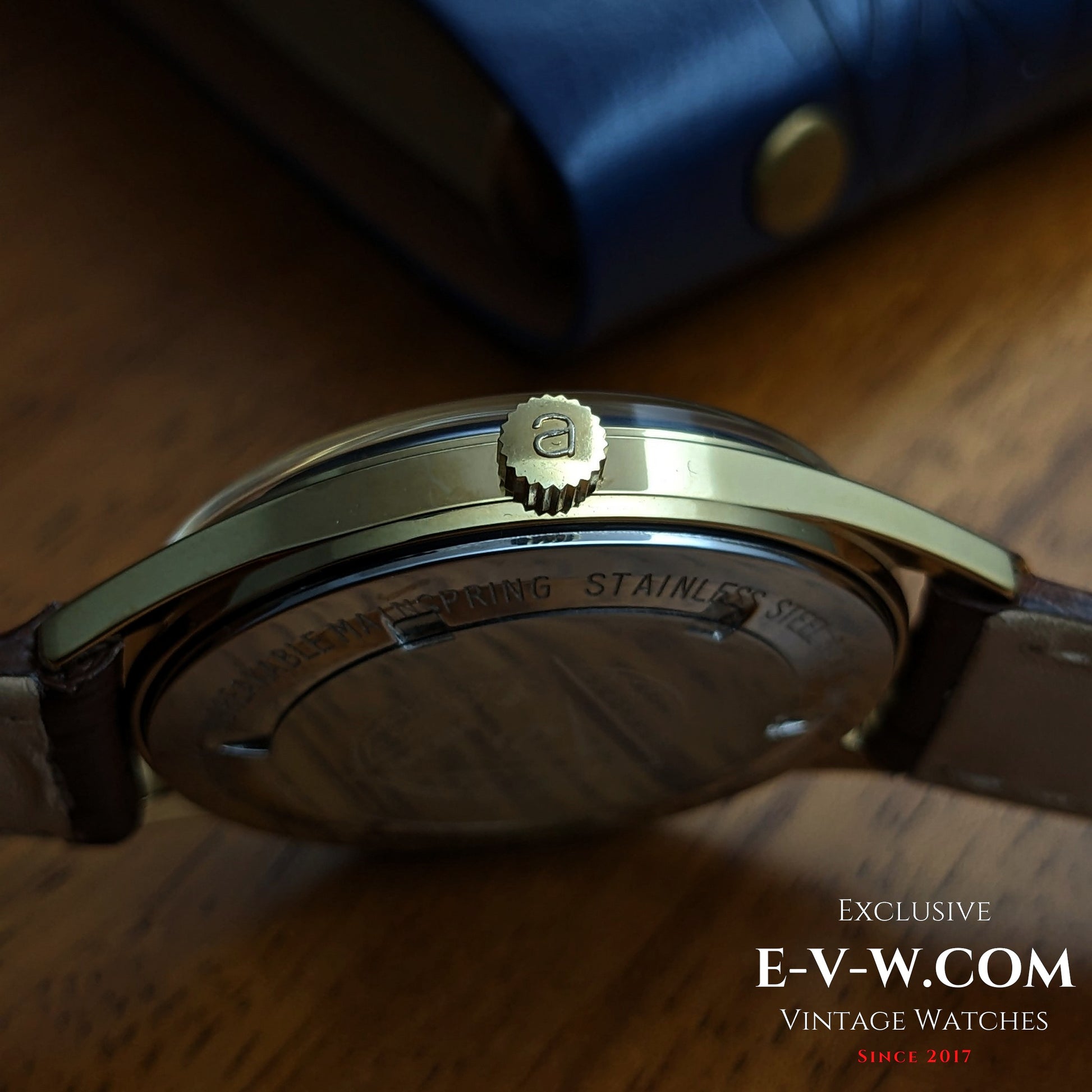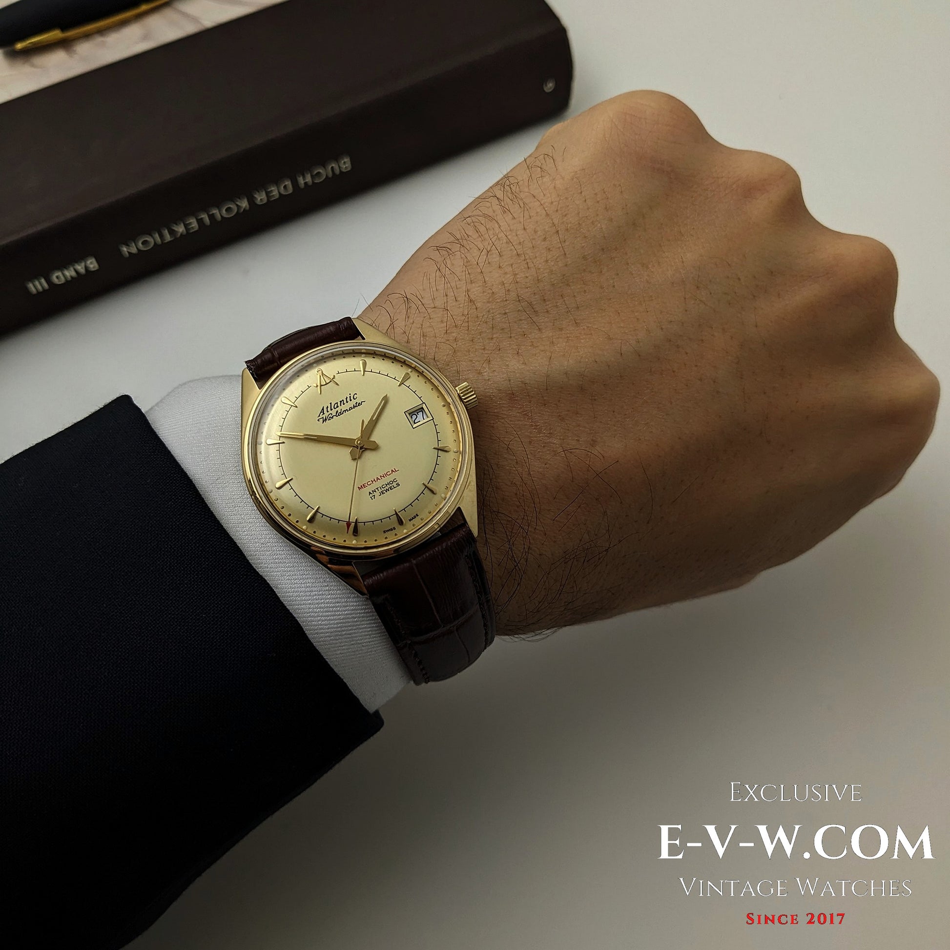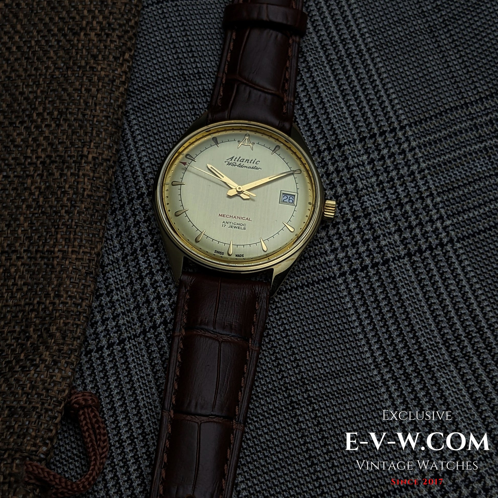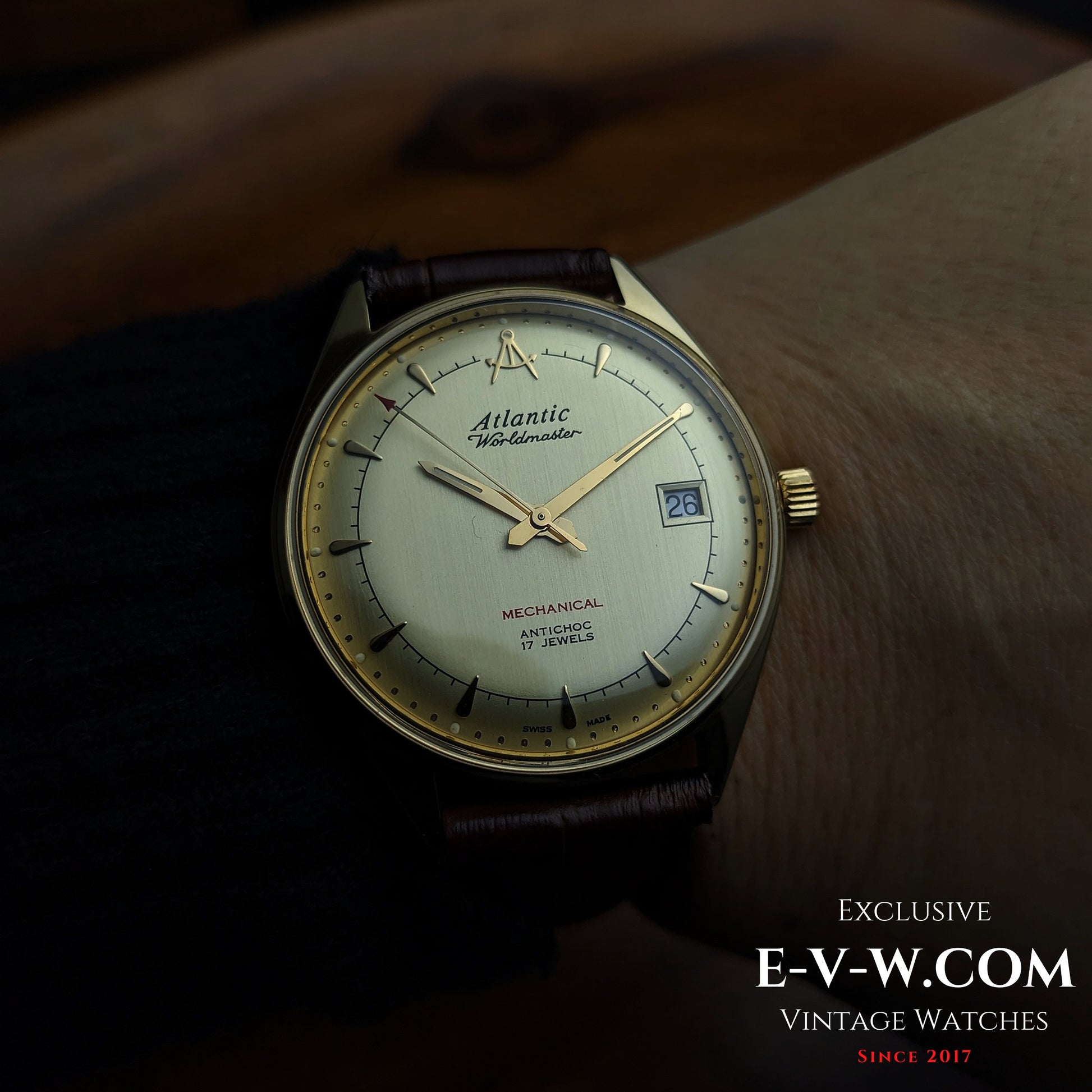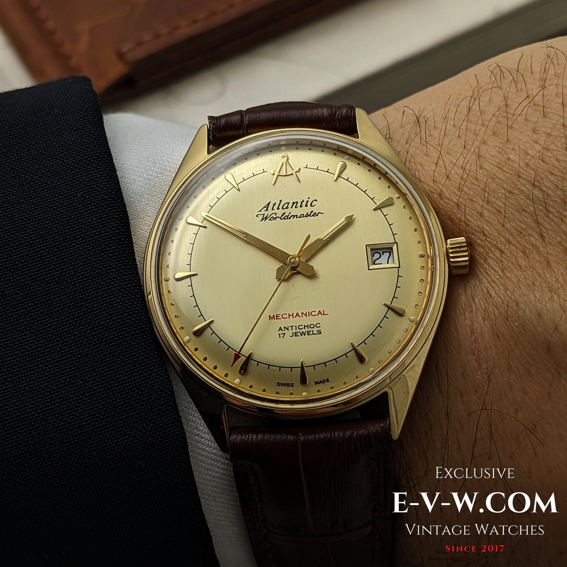 L'Atlantic Worldmaster avec calibre 969-4M à remontage manuel correspond à la période de production des années 1960, ce qui correspond à la disposition du cadran, au style du logo et aux proportions du boîtier plaqué or que l'on voit ici.
