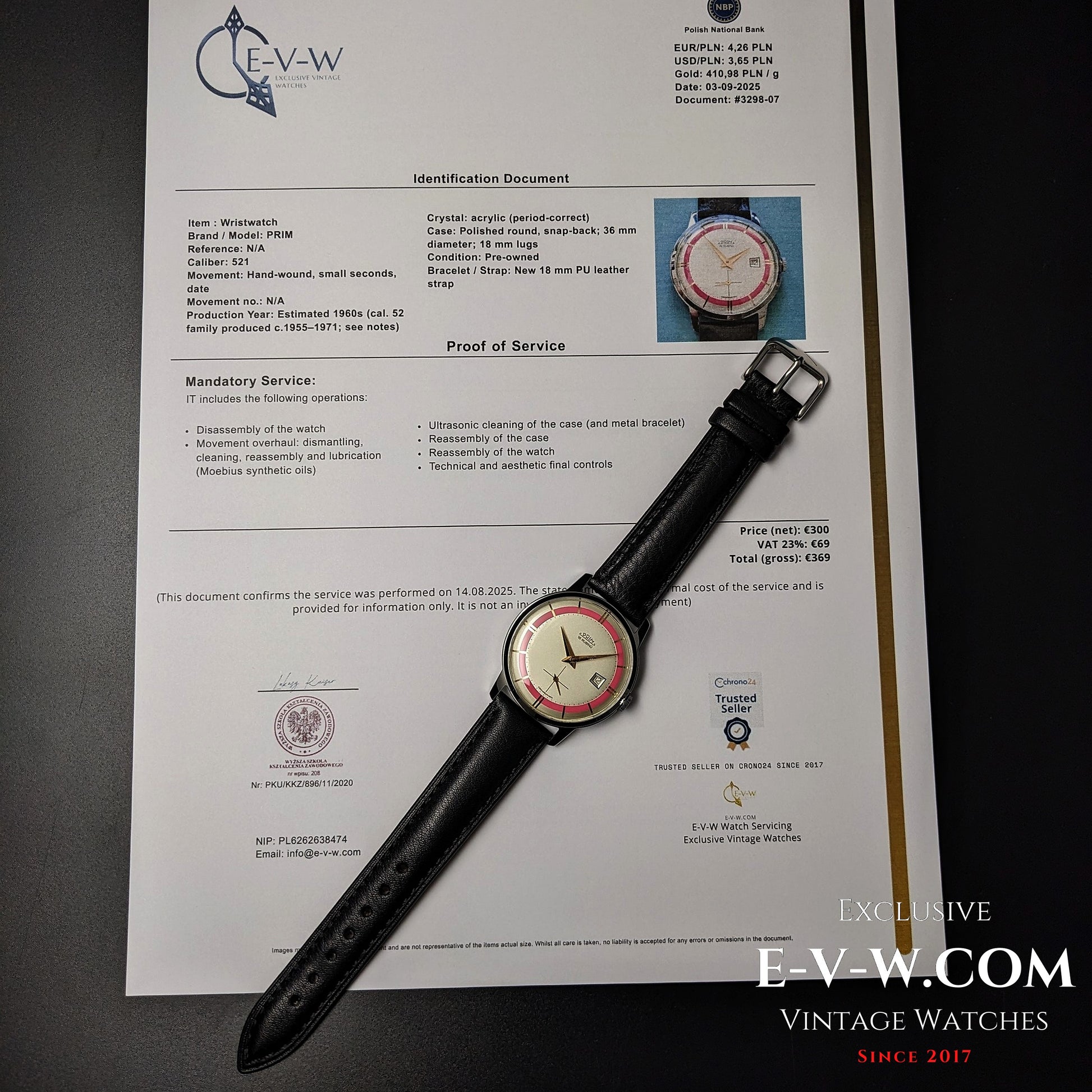Le mouvement est estampillé « 521 » ; il s'agit de la famille PRIM cal. 52 (petite seconde + date), produite vers 1955-1971, ce qui situe cet exemplaire dans les années 1960.