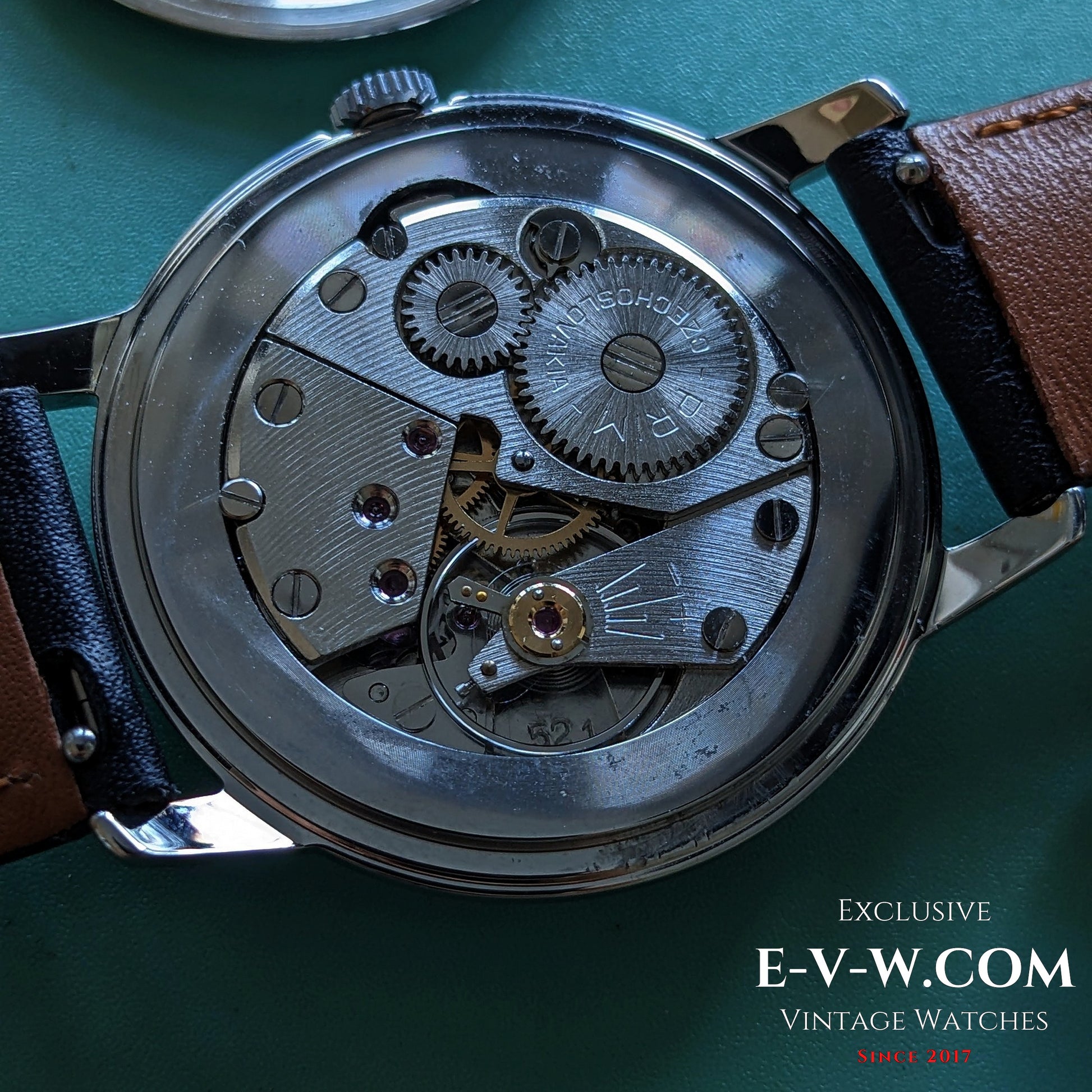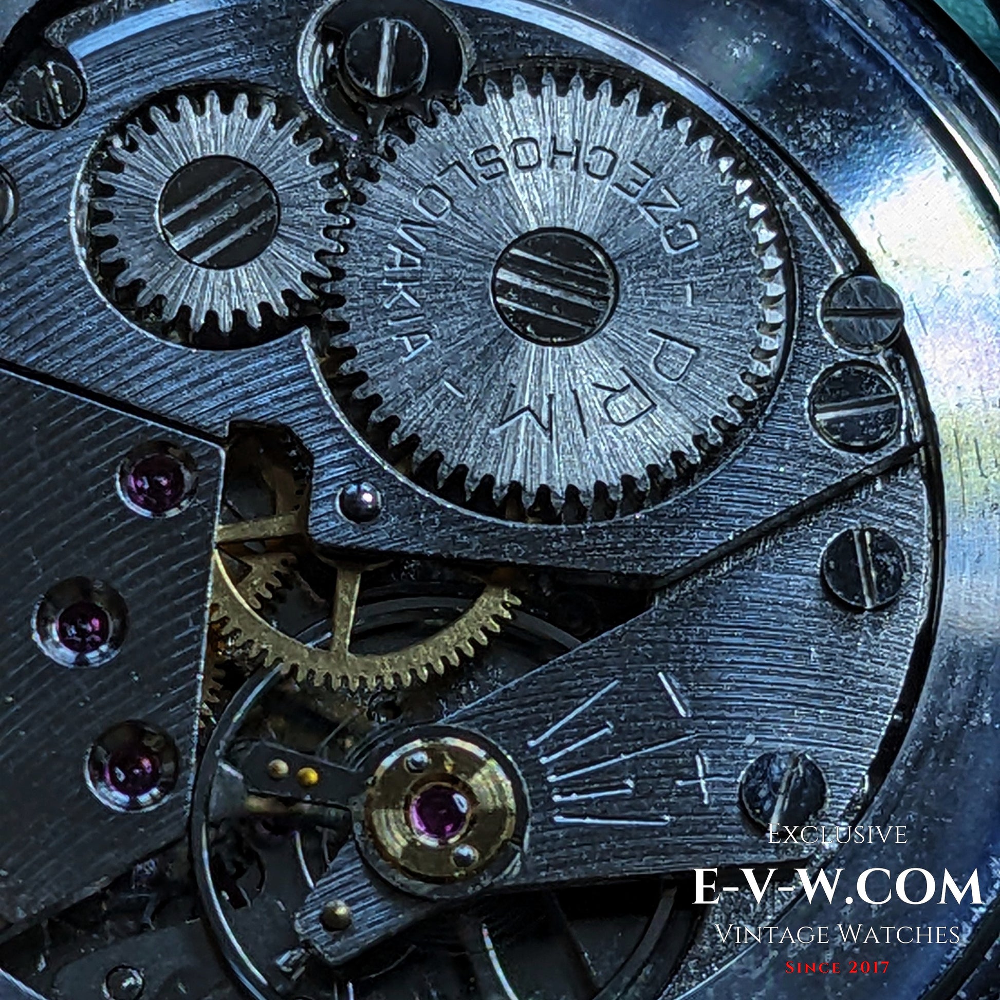 Cadran : centre argenté avec réhaut rose ; index et aiguilles dorés ; « TCHÉCHOSLOVAQUIE »