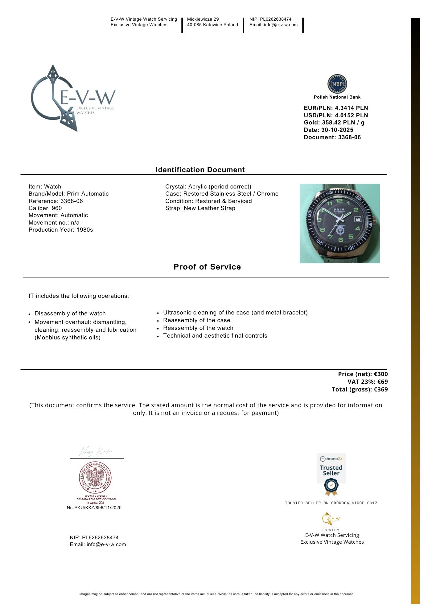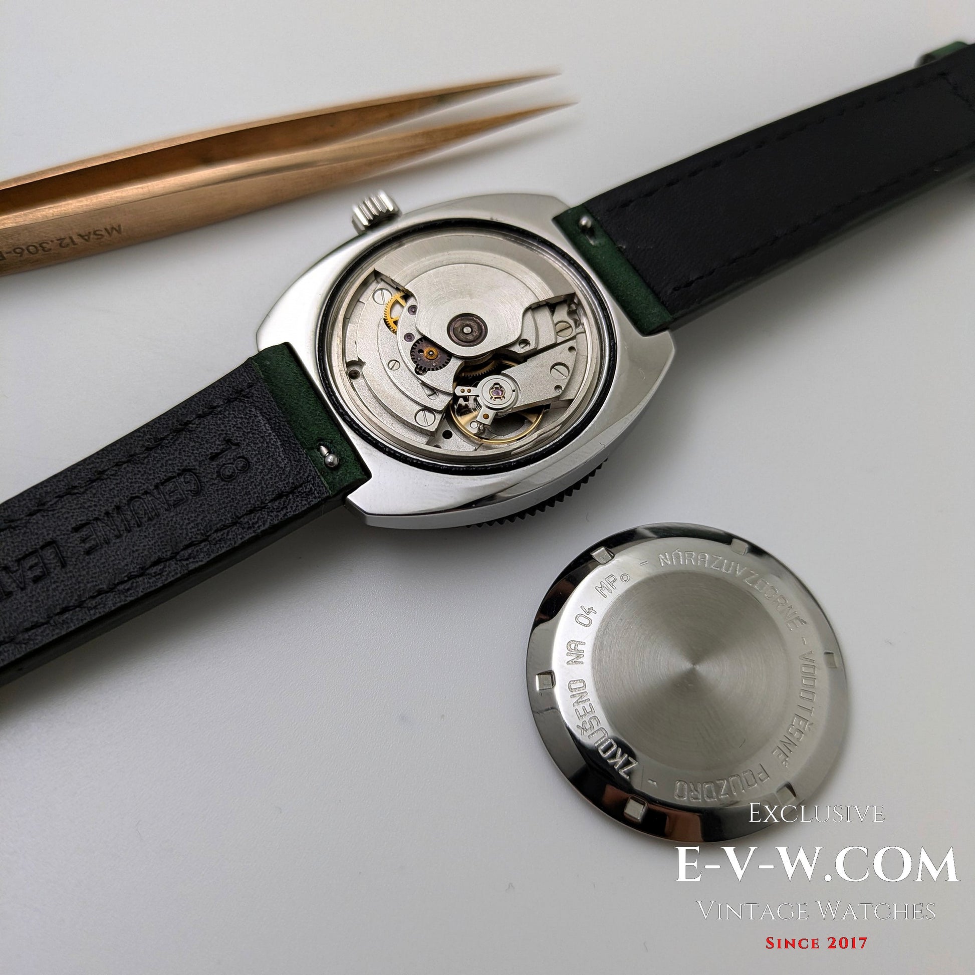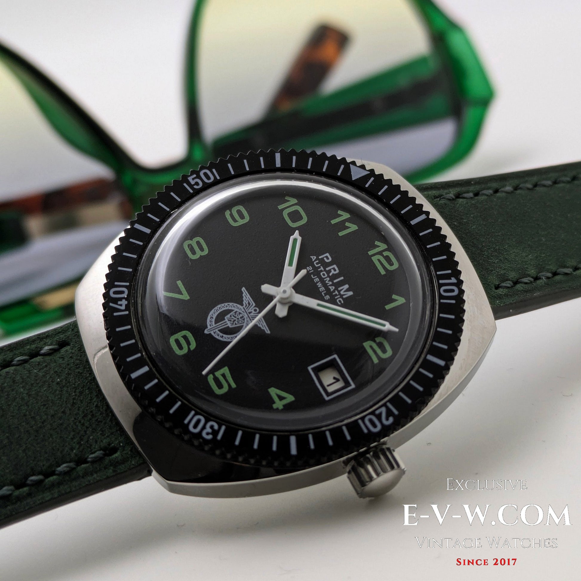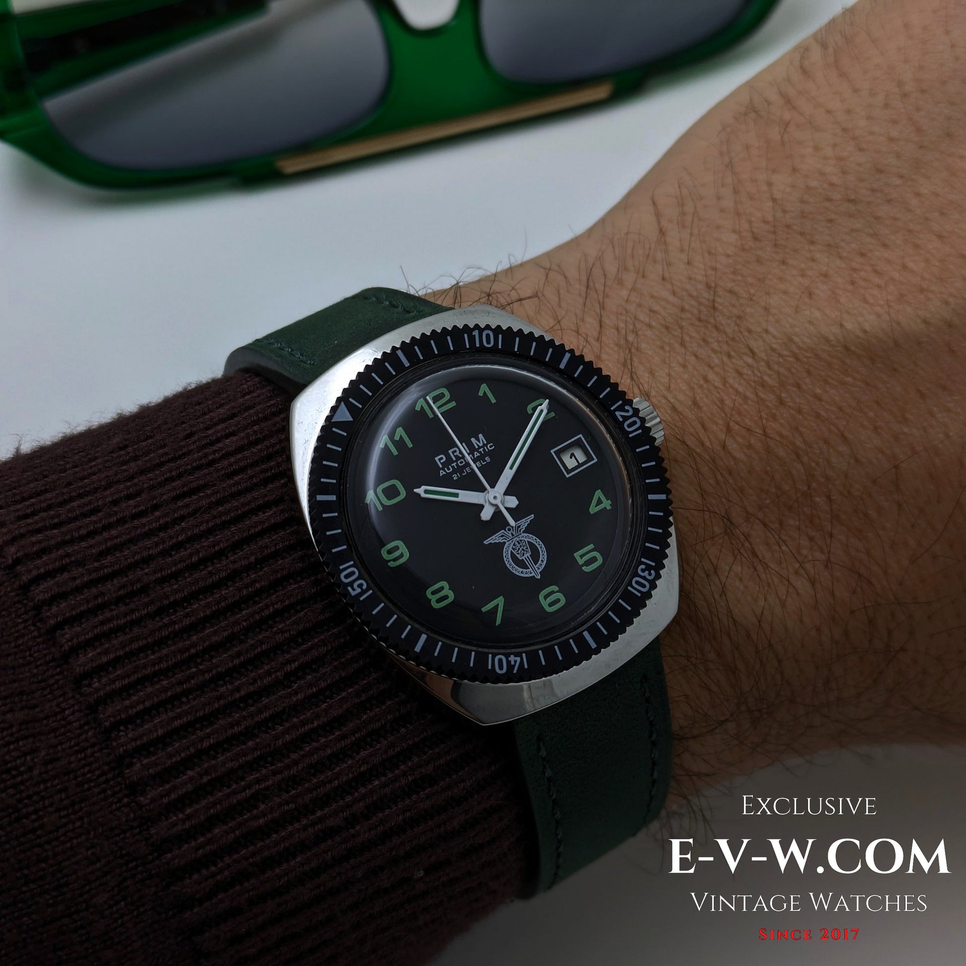 La Prim Automatic, animée par le calibre 960, représente le summum technologique de l'horlogerie tchécoslovaque de la fin des années 1970 et des années 1980. Ce calibre était l'un des mouvements les plus sophistiqués produits par la manufacture Elton de Nové Město nad Metují, doté d'un système de remontage automatique robuste et d'une fréquence d'oscillation élevée de 21 600 alternances par heure pour une précision accrue. Cet exemplaire a fait l'objet d'une restauration complète : le boîtier, le cadran et les aiguilles ont été remis à neuf par des professionnels afin de retrouver son esthétique d'origine. Il constitue une pièce importante de l'histoire horlogère du bloc de l'Est, alliant robustesse et fiabilité à la précision d'ingénierie de la série 9.