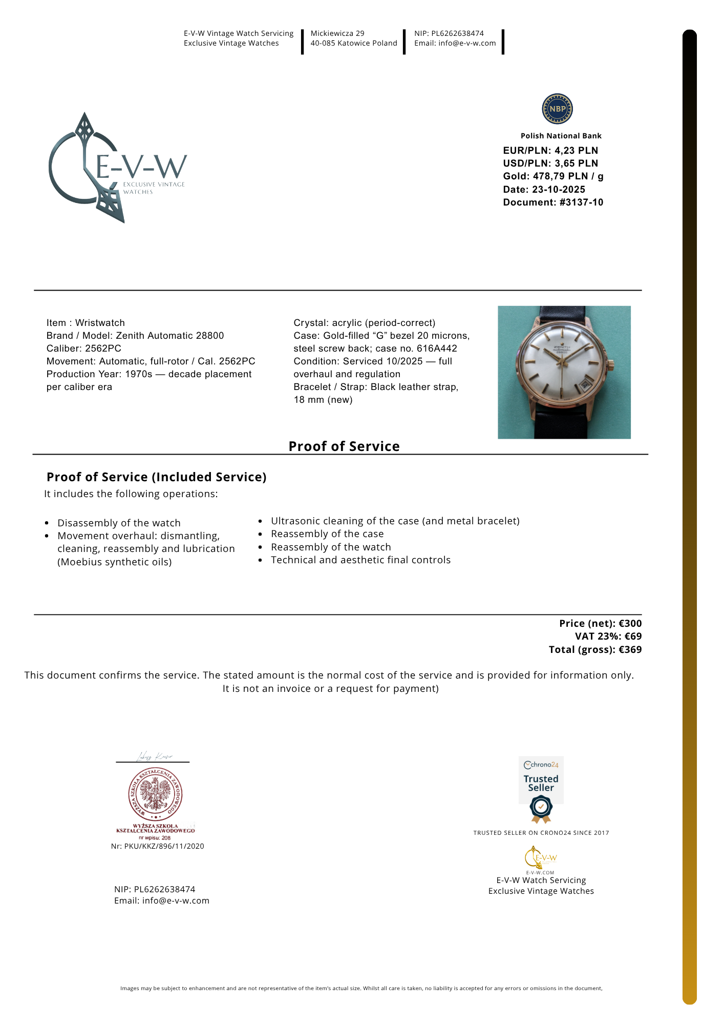 Mouvement : Automatique, Omega Cal. 565, 24 rubis, ~19 800 alt/h. Révision effectuée en octobre 2025 — facture incluse.