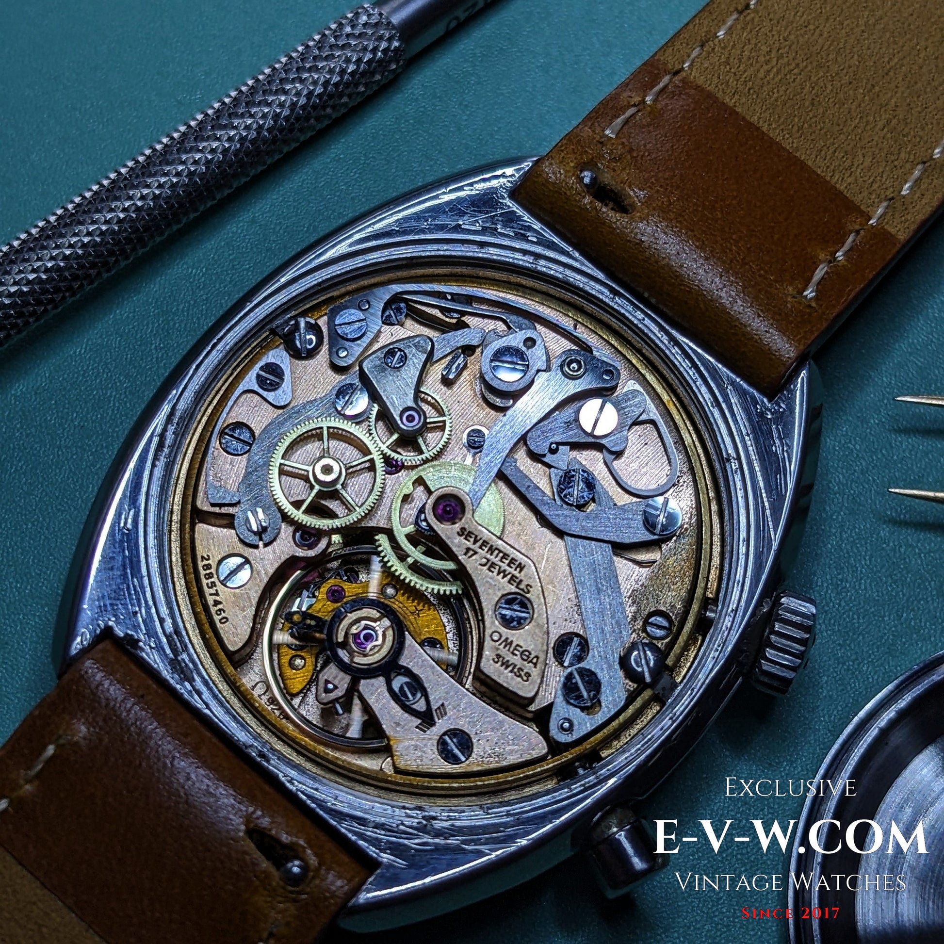 Mouvement : Omega Cal. 920 Chronostop à remontage manuel , 17 rubis , ~21 600 A/h ; révisé en juillet 2025
