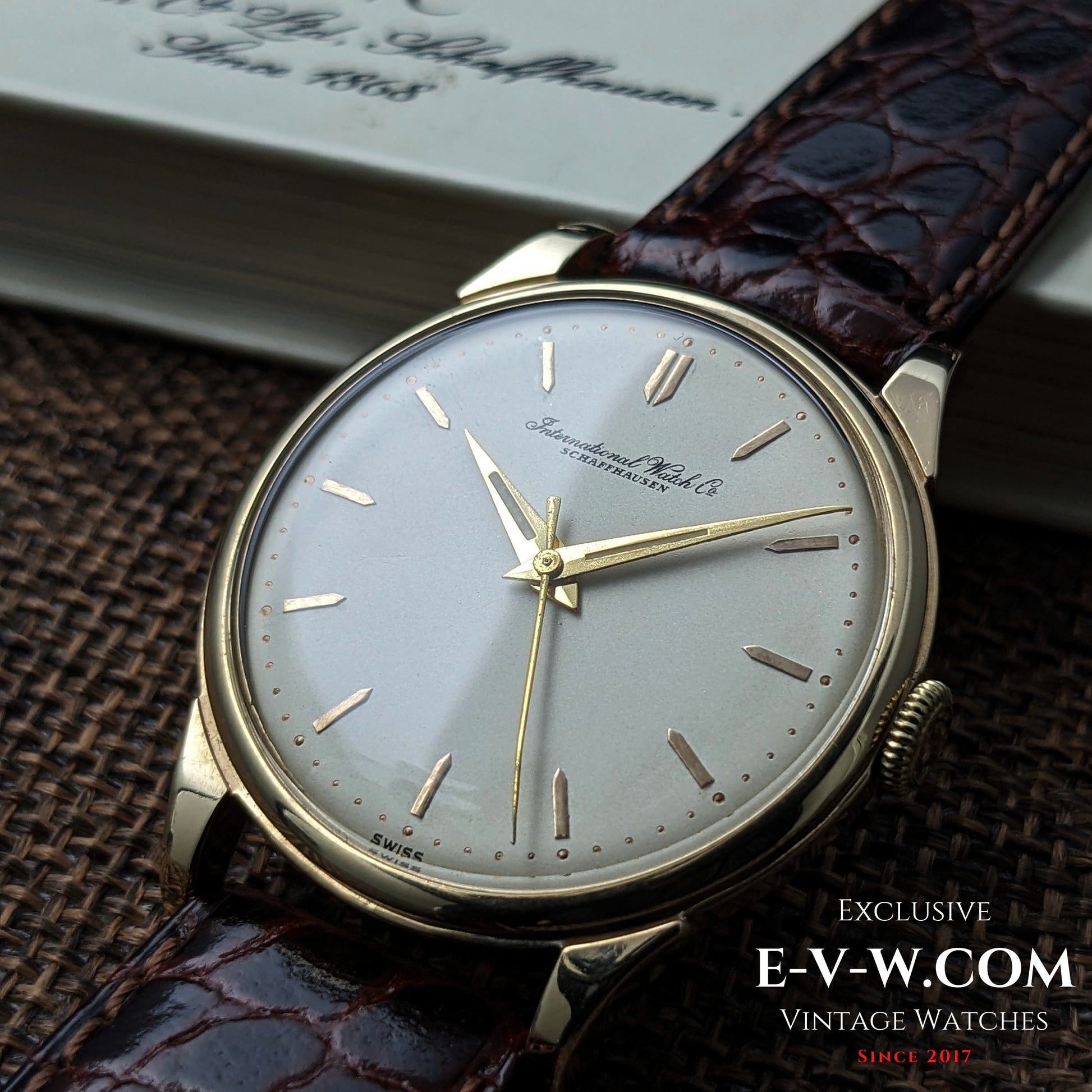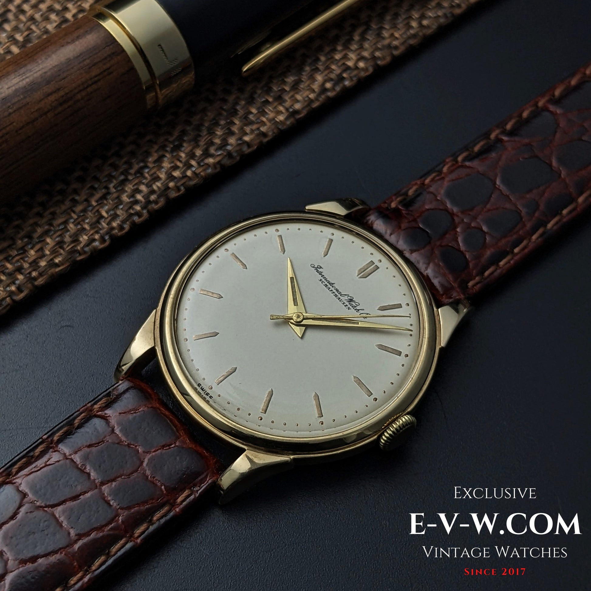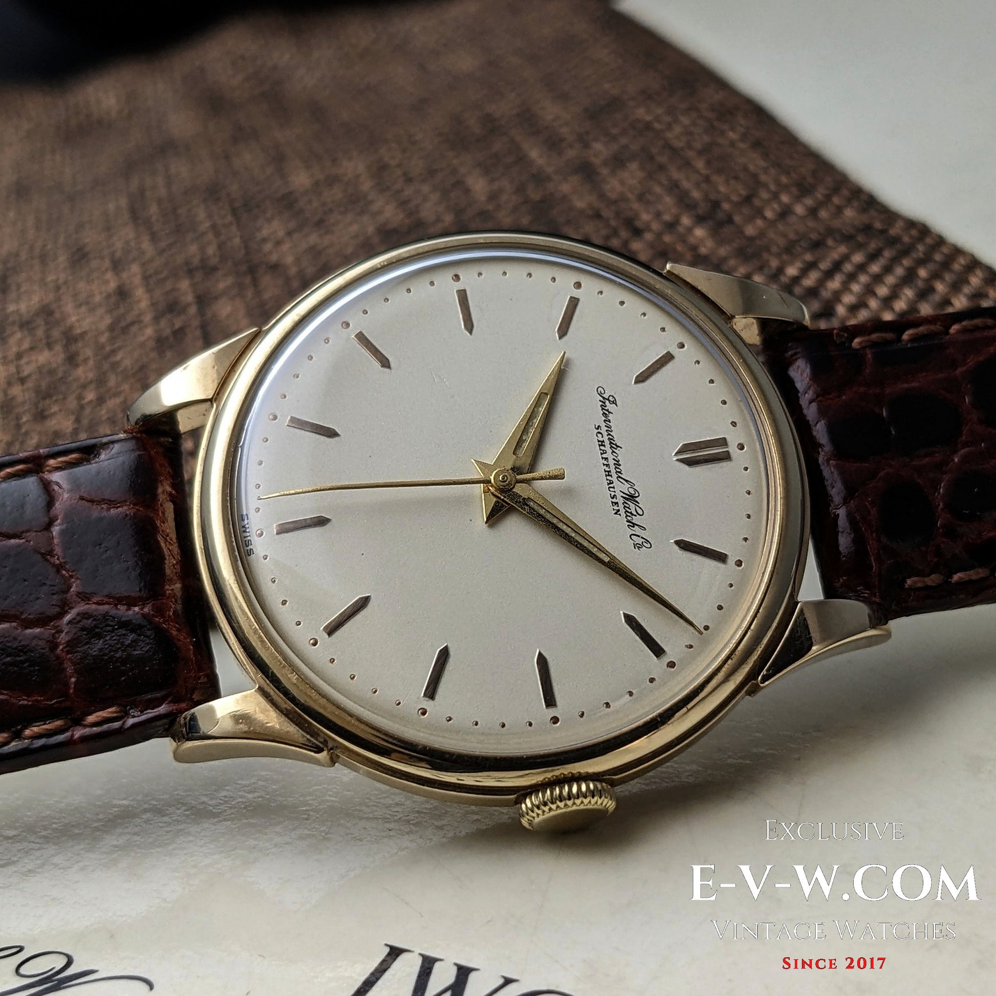Mouvement n° ******37 (numéro complet figurant dans les documents de l'acheteur). D'après les tables de numérotation des mouvements IWC, ce modèle date de 1957. Le cadran a été restauré par un professionnel. Boîtier en or 9 carats avec entre-cornes de 18 mm ; verre acrylique (conforme à l'époque). Présentée sur bracelet cuir.