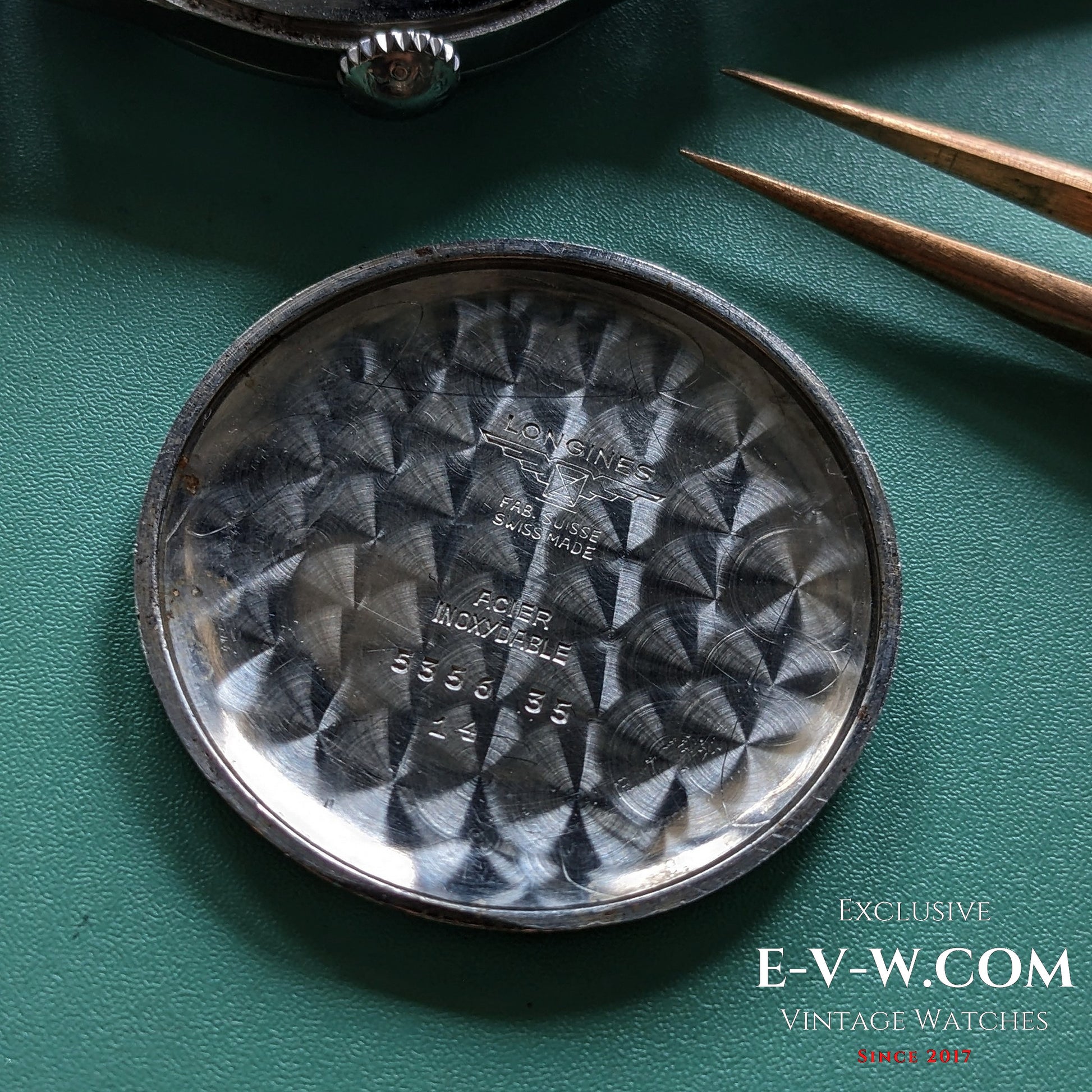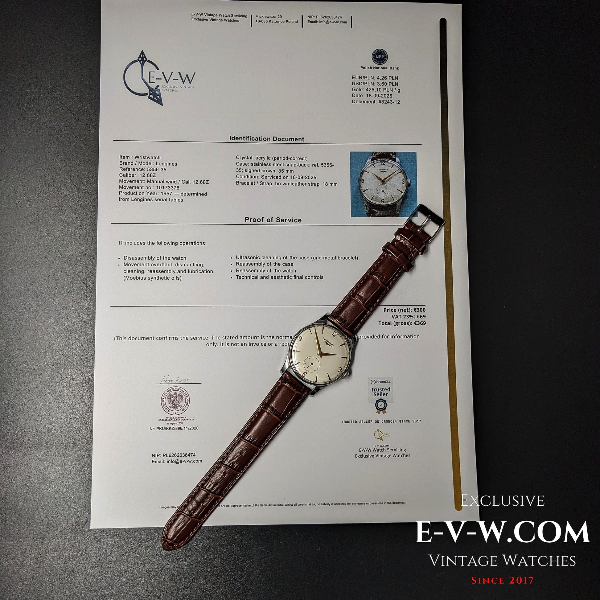 Le numéro de série du mouvement 1017••••76 (numéro complet dans les documents de l'acheteur) situe la production en 1957 selon les tableaux publiés de Longines ; cohérent avec le cal. 12.68Z et la référence du boîtier 5356-35.