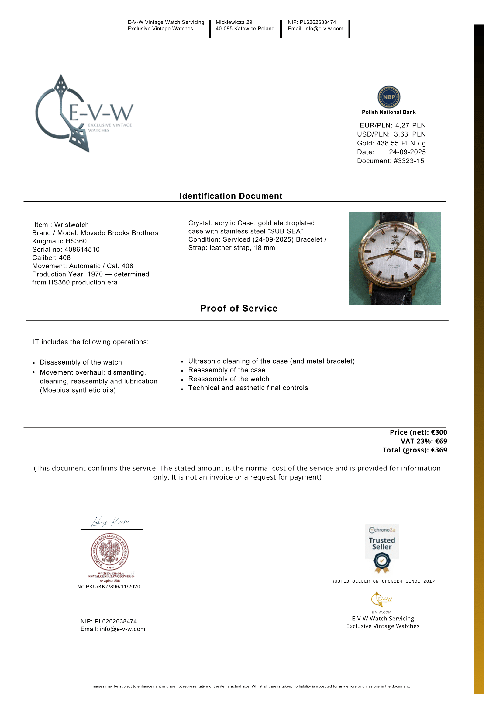 📄 Un certificat de service officiel est fourni, répertoriant les principaux détails techniques et d'identification — idéal pour l'assurance, la provenance ou une revente future.