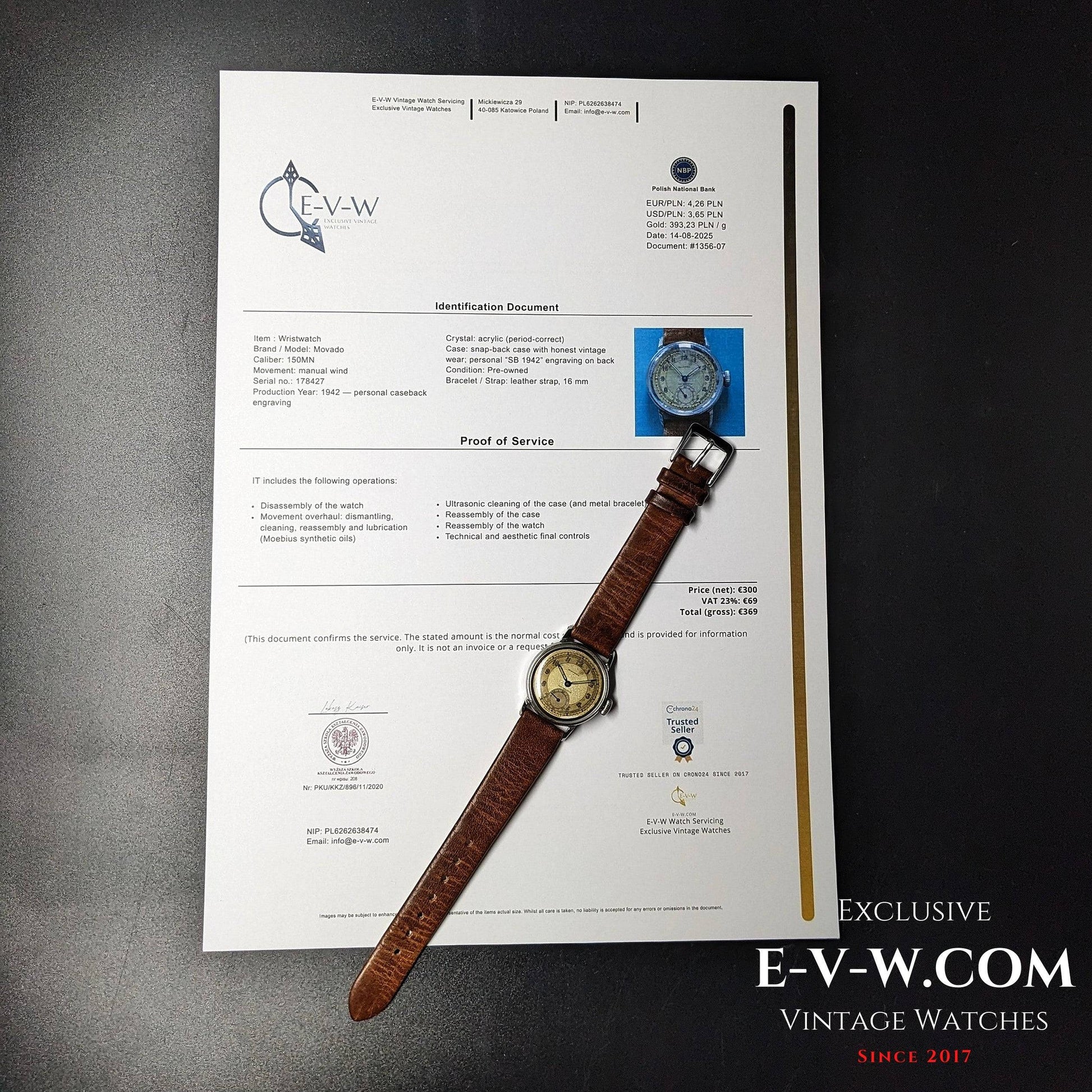 Gravure au dos du boîtier « 1942 », cadran sectoriel d'époque et mouvement de manufacture 150MN : caractéristiques d'une production du début des années 1940 ; numéro de série du mouvement **••27 (numéro complet dans les documents de l'acheteur). Conçue dans l'ombre de la guerre : sobre, lisible et facile d'entretien.
