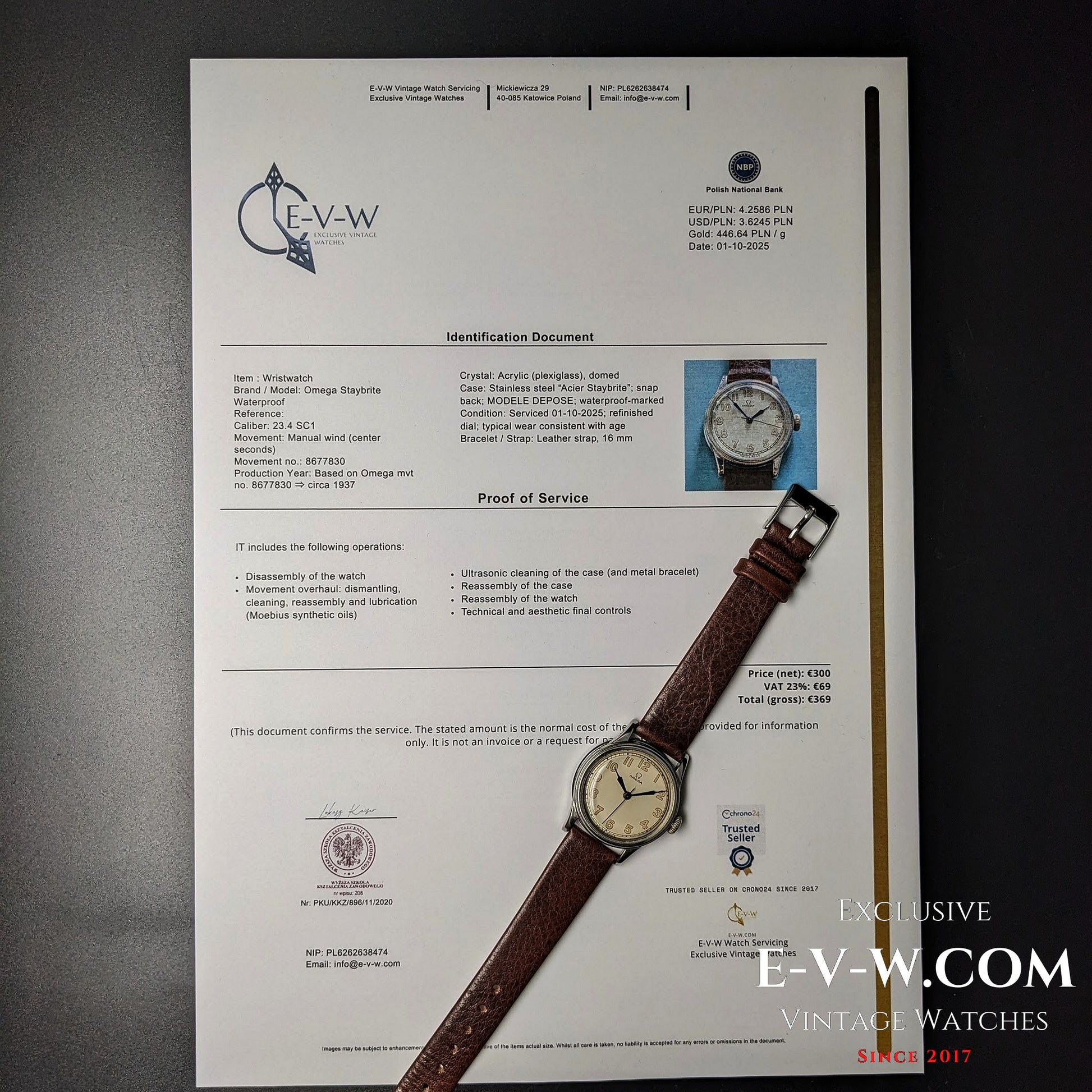 Mouvement : Omega cal. 23.4 SC1 à remontage manuel, 15 rubis, 18 000 A/h ; secondes centrales ; révisé le 01-10-2025.