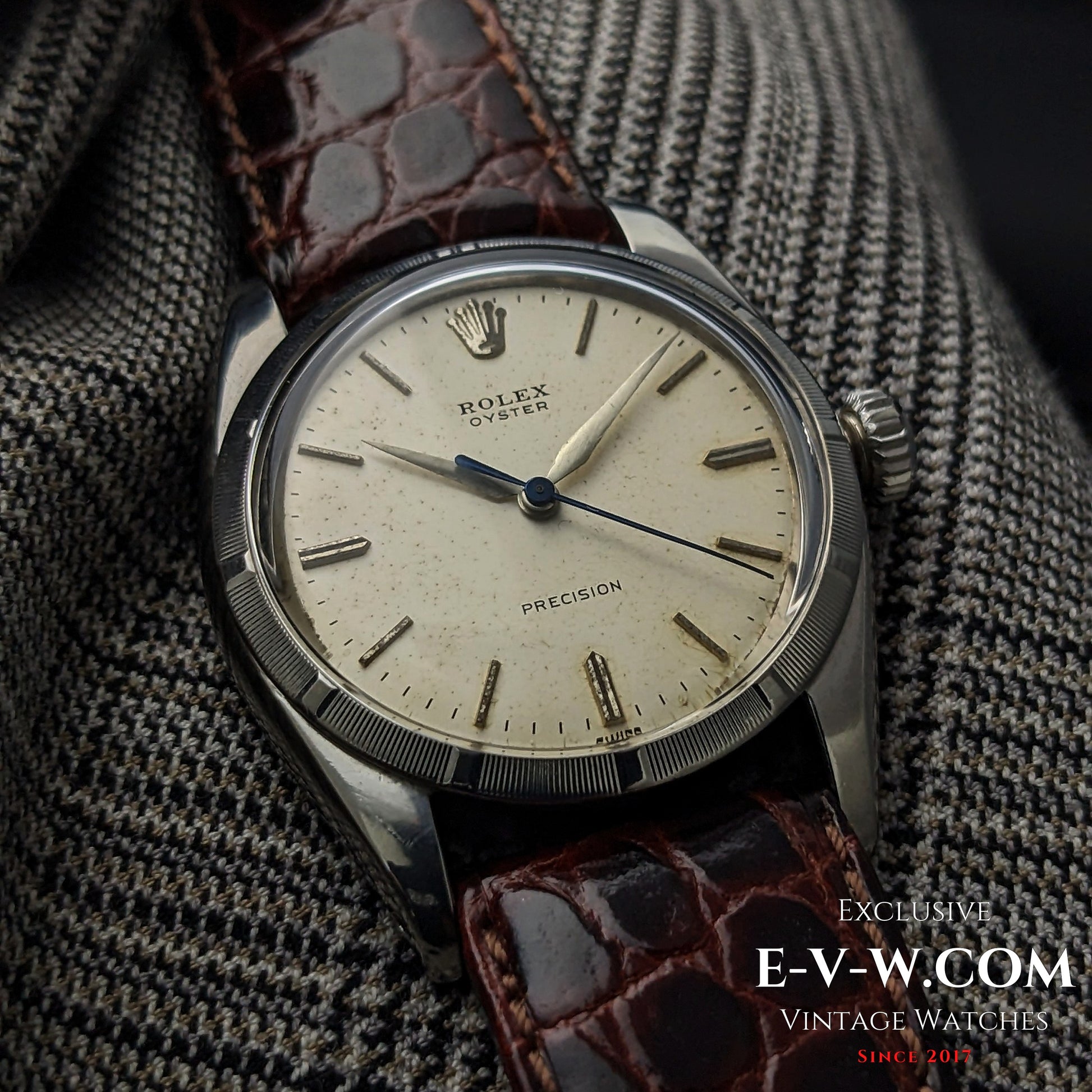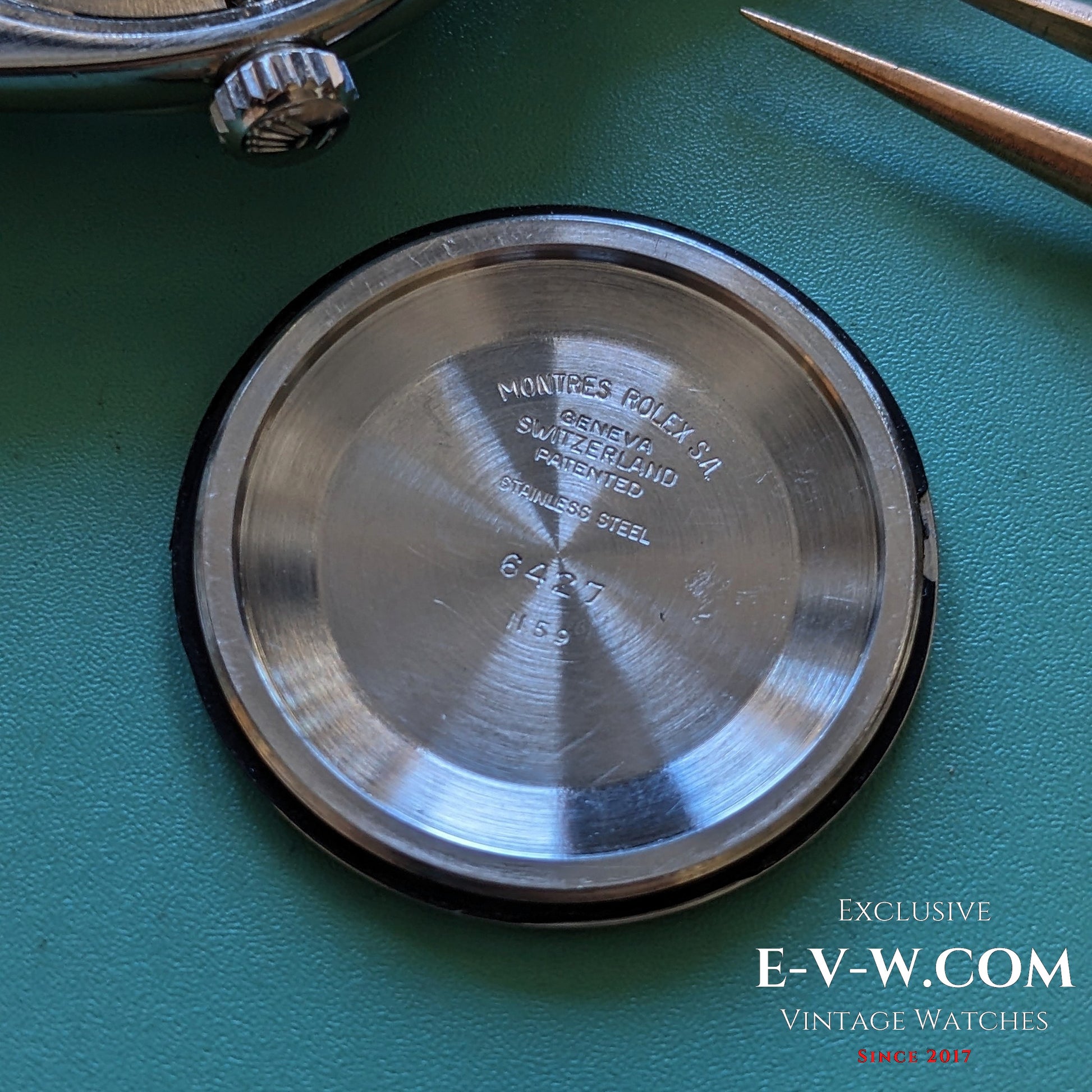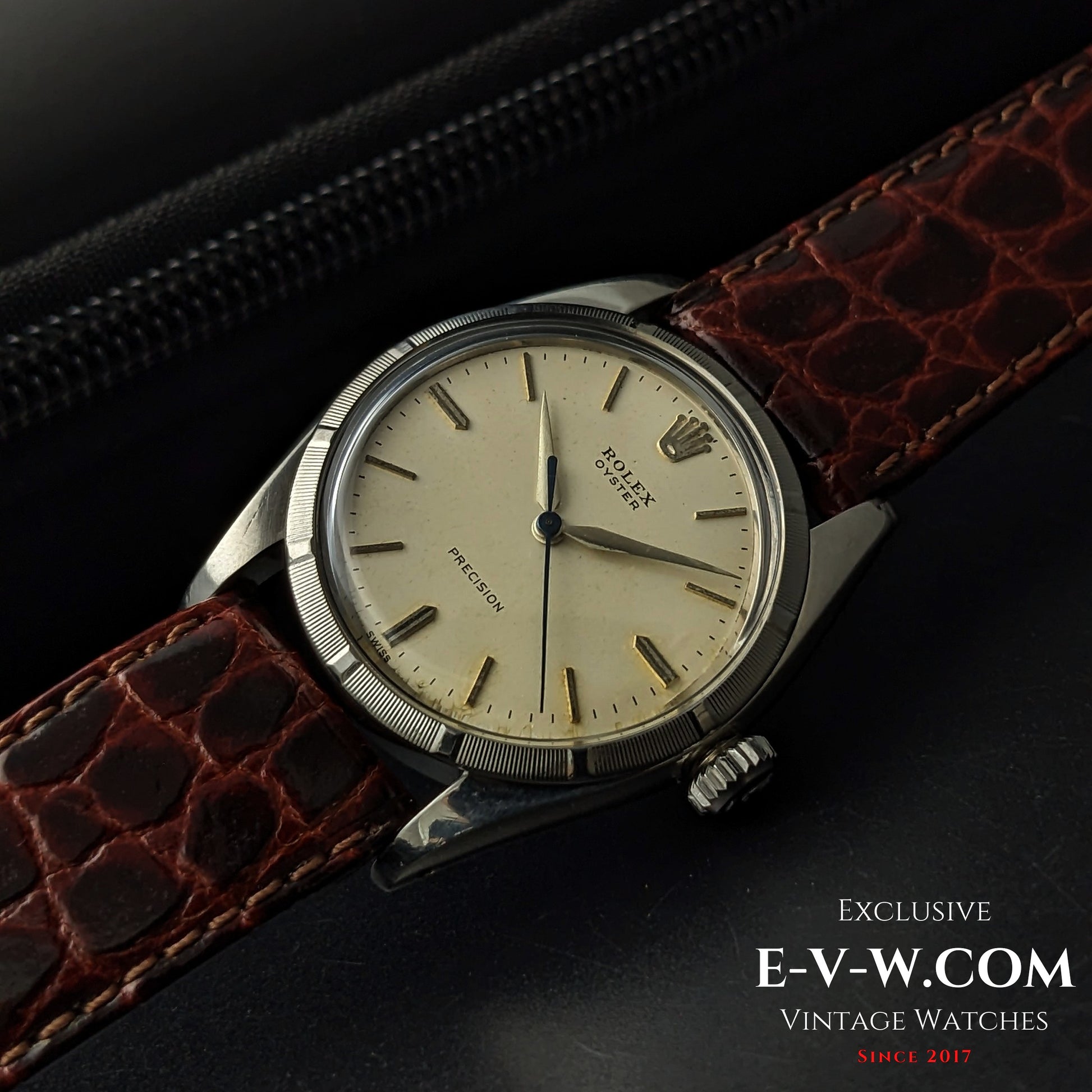 Mouvement n° N••••84 (numéro complet dans les documents de l'acheteur). Référence 6427 d'époque, avec calibre 1210 et caractéristiques esthétiques, ce modèle date du début des années 1960. Révision effectuée en septembre 2025 avec certificat. Le fond de boîtier est estampillé « IV.59 », ce qui situe cette référence 6427 à la fin de 1959 – une Oyster « SWISS » des premières années, antérieure au tritium, produite exclusivement par Rolex durant la courte période des lunettes guillochées, très prisée des collectionneurs. L'absence de matière luminescente sur votre Oyster Precision référence 6427 (fond de boîtier « IV.59 ») correspond à une option « non luminescente » d'origine, disponible sur commande au catalogue. À la fin des années 1950, le radium était encore la norme, mais les préoccupations sanitaires croissantes et les premières réglementations ont conduit Rolex à proposer les mêmes Oyster « avec ou sans matière luminescente ». Votre exemple montre l'inscription « SWISS » sans « T », des aiguilles lisses sans encoches luminescentes et aucun index — autant d'éléments caractéristiques d'une fabrication sans matière luminescente. Historiquement, ce modèle se situe juste avant le passage au tritium (vers 1963-1964, marqué « T SWISS T »/« T<25 »). Les collectionneurs apprécient ces cadrans car ils sont plus rares, souvent mieux conservés (absence de brûlures de radium) et non radioactifs.