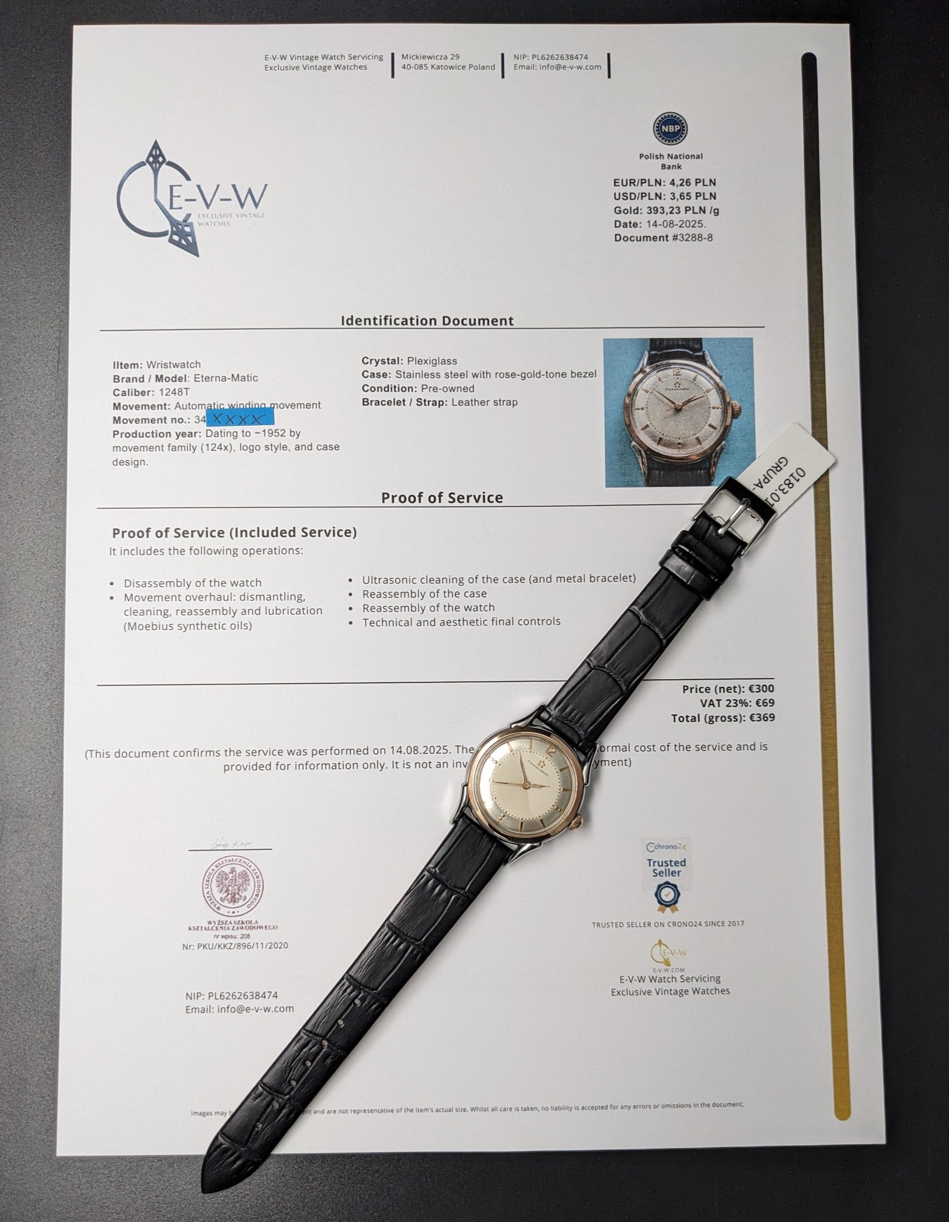 Service (08.2025) — démontage complet ; nettoyage par ultrasons ; remontage et lubrification (huiles Moebius) ; réglage et synchronisation ; nettoyage du boîtier et du cristal (pas de polissage des poinçons) ; contrôle qualité final.