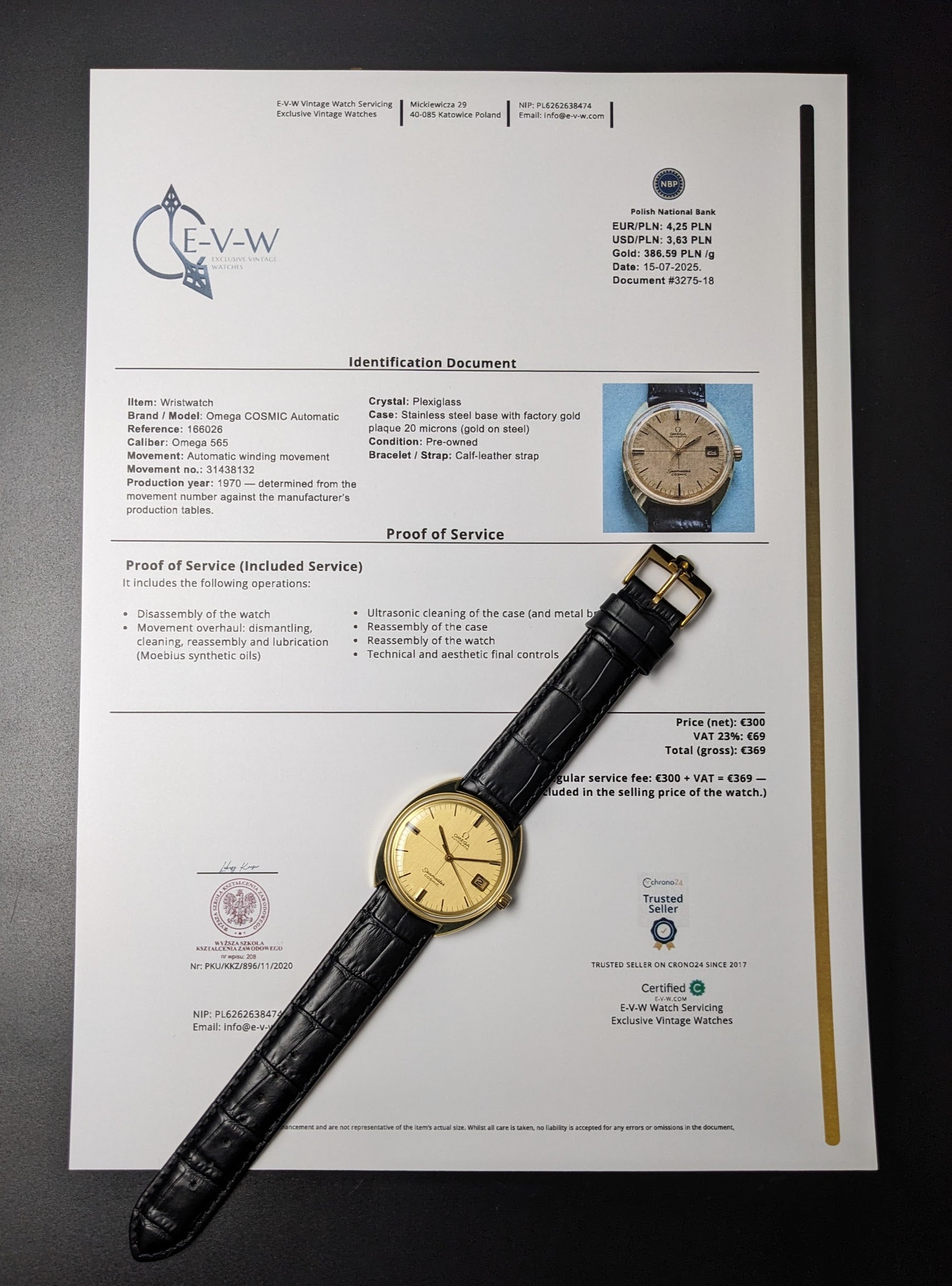 Mouvement : Omega Cal. 565 automatique, 24 rubis, 19 800 A/h ; révisé le 15-07-2025.