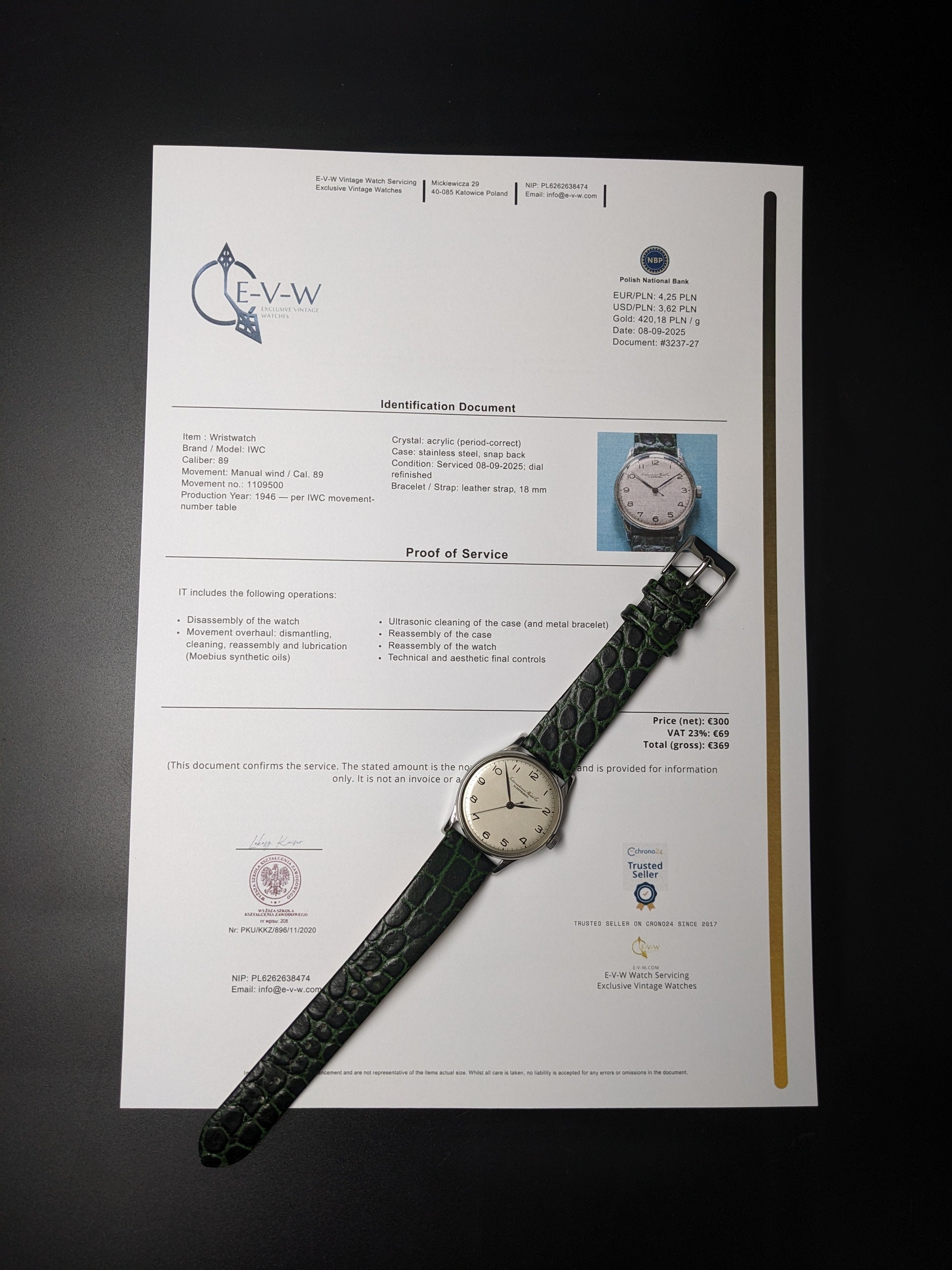 Mouvement : Manuel, calibre IWC 89, 17 rubis, 18 000 A/h — révisé en septembre 2025