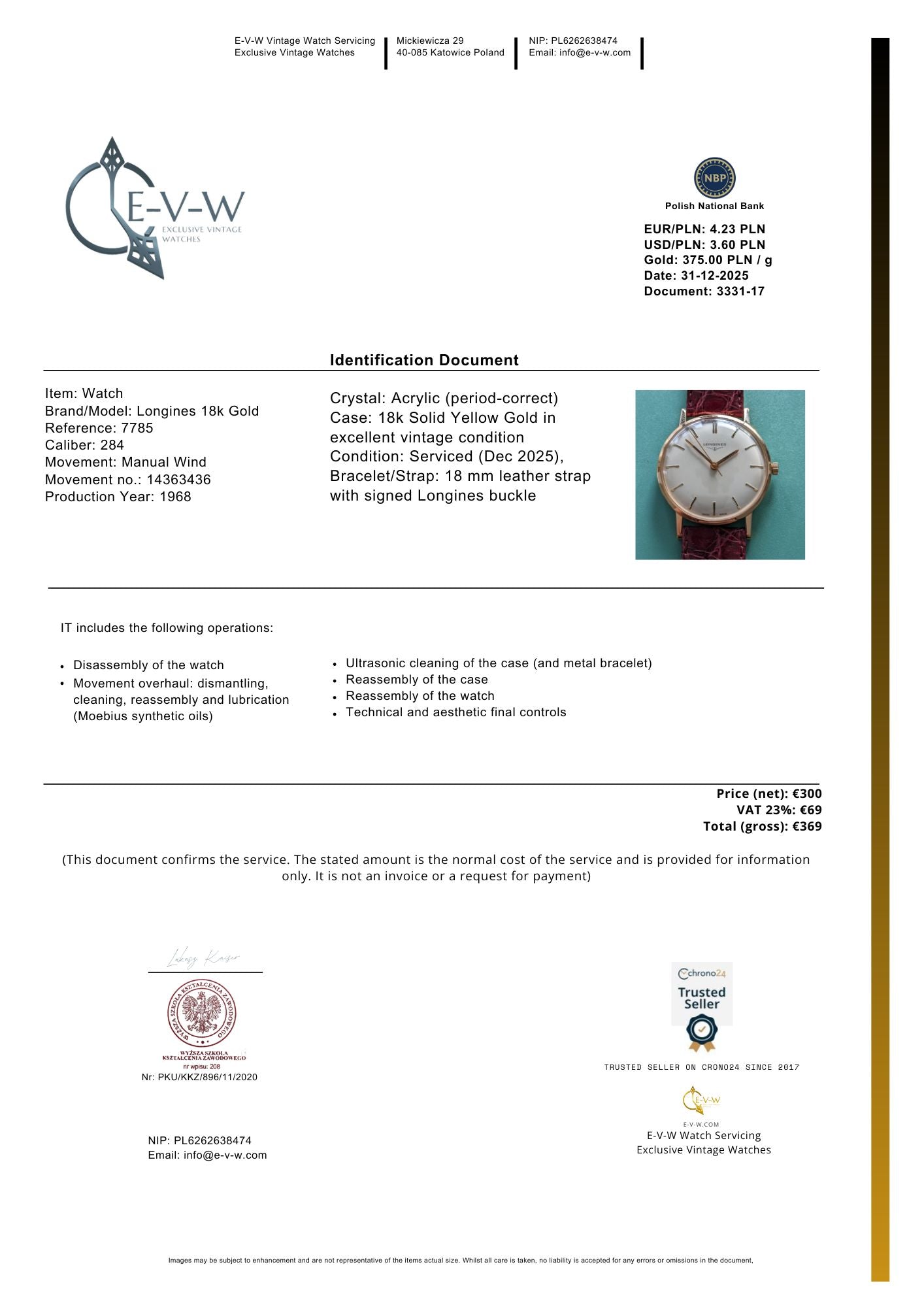 Documents : Facture et certificat de service d'une valeur de 369 € — inclus gratuitement