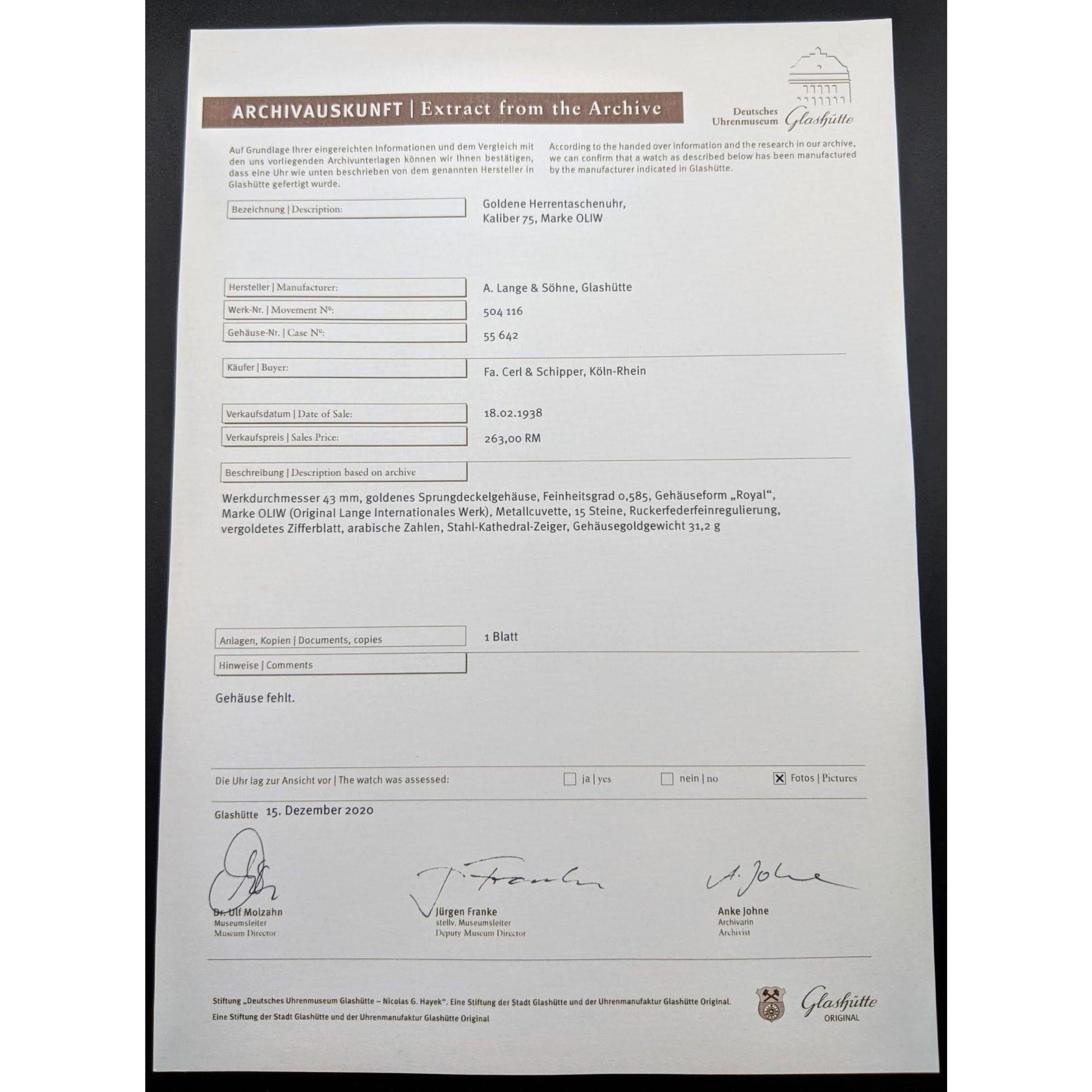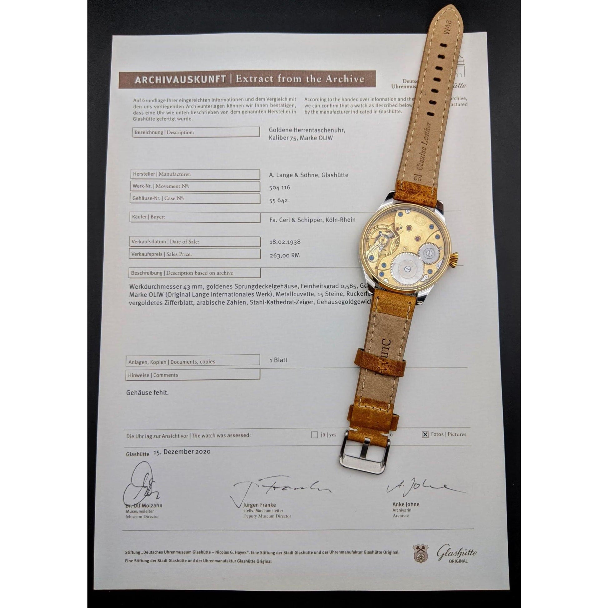 La « OLIW » (Original Lange Internationales Werk) représente un chapitre fascinant de l'histoire de la Deutsche Uhrenfabrikation (Glashütte) . Fabriqués vers 1938, ces mouvements sont aujourd'hui d'une rareté exceptionnelle. Les archives historiques indiquent qu'environ 6 500 exemplaires seulement ont été produits , ce qui rend cette montre bien plus rare que les modèles de série de l'époque. Elle témoigne du savoir-faire allemand, à la fois robuste et précis, de la fin des années 1930.
