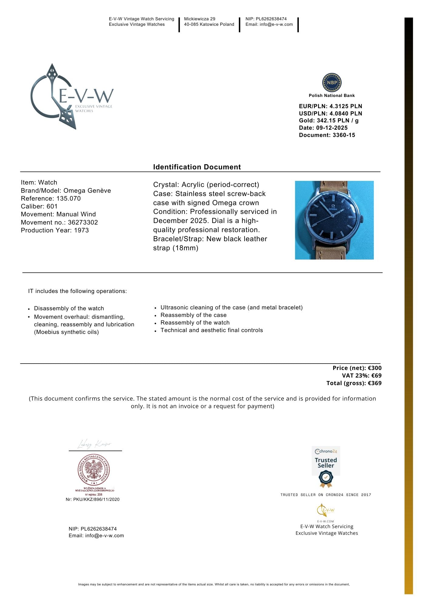 Documents : Facture et certificat de service d'une valeur de 369 € — inclus gratuitement