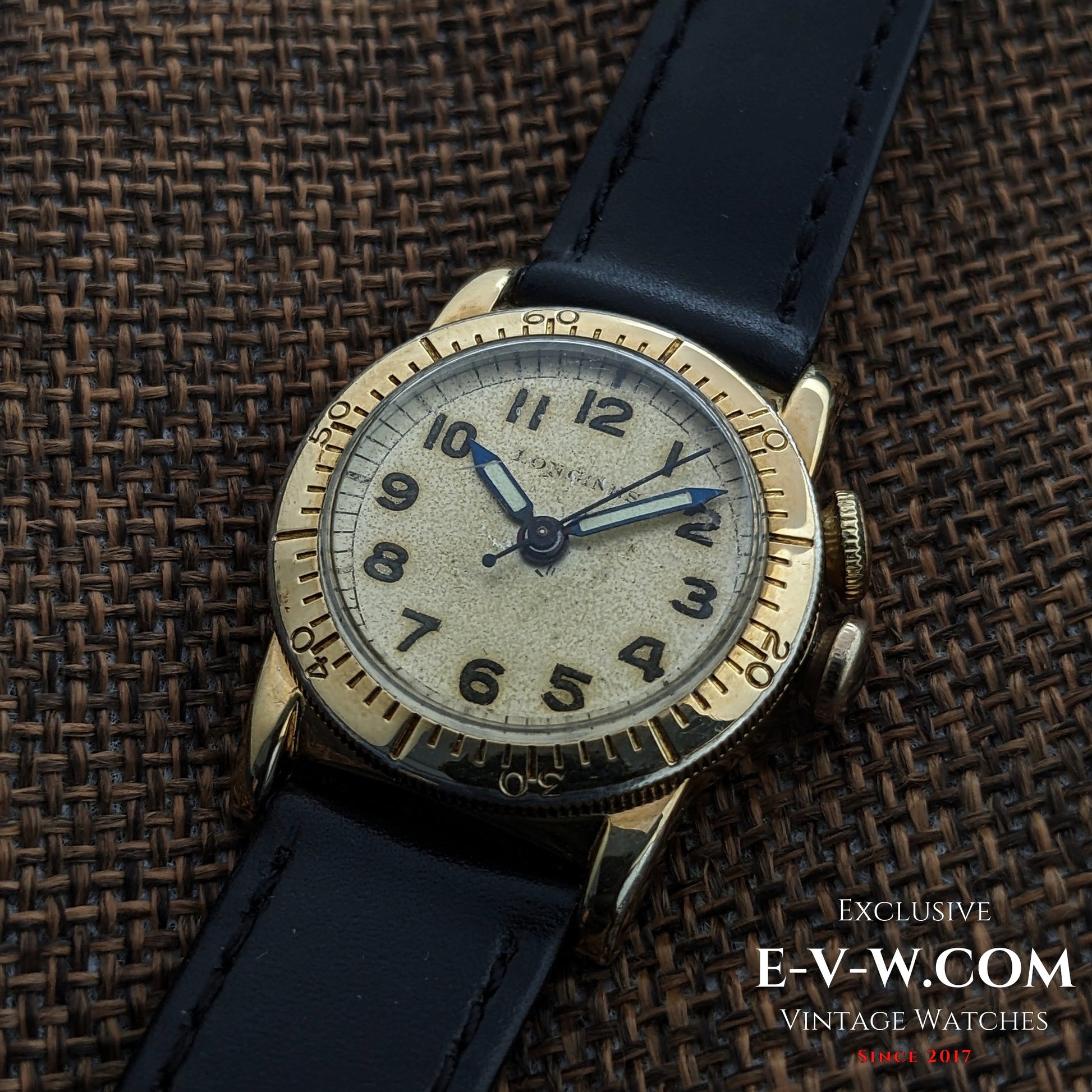 Ce Ce modèle particulier a été conçu et chronométré aux États-Unis selon les travaux de Weems et Lindbergh. pilote montre construit autour du brevet américain de Philip Van Horn Weems tournant système de réglage des secondes de la lunette — l'un des premiers montres-bracelets créé pour aider aviateurs synchroniser Au réglage précis de l'heure radio . Disponible dans notre boutique. Un design inspiré de l'ère de la mobilisation , avec double couronne rotative. minutes lunette et transparent arabe des chiffres exactement le genre de pratique outil Montre Longines livrée au marché américain dans les années 1940. Date est basé sur le mouvement Longines cal. 10L un nombre aux alentours de 6,7 millions et le plaqué or 10 carats AG de fabrication américaine cas Signé « Emballé et chronométré aux États-Unis par Longines ».