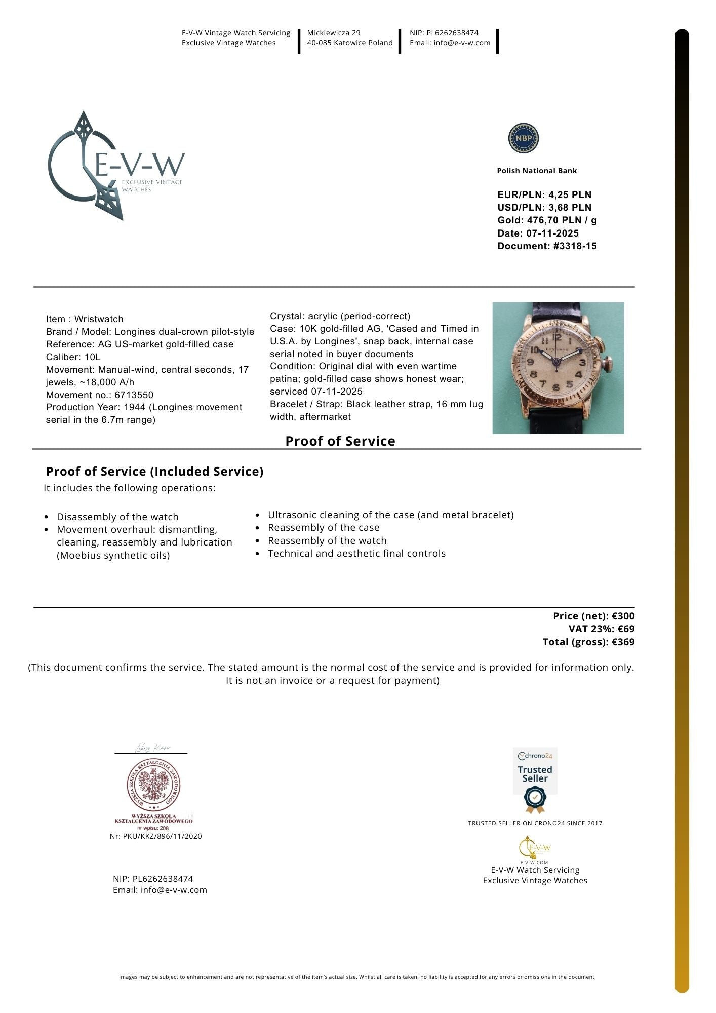 Mouvement : Longines cal. 10L à remontage manuel, 17 rubis , ~18 000 alt/h ; révisé en novembre 2025 ( certificat) . inclus ).